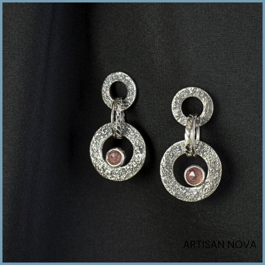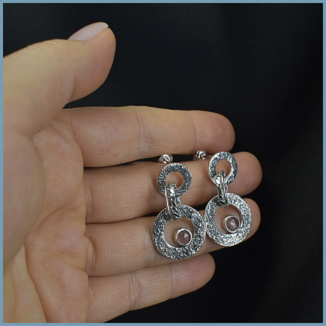 Kolczyki srebro 925 z kwarcem truskawkowym w formie wiszących kół o surowej fakturze z fasetowanym kamieniem osadzonym w centralnej części.