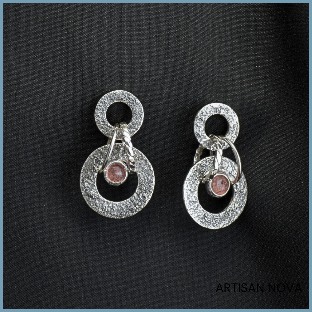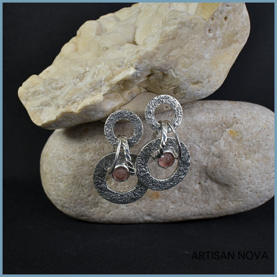Kolczyki srebro 925 w formie wiszących kół o surowej, połyskującej fakturze. Centralnym elementem jest fasetowany kwarc truskawkowy osadzony w większym kole kompozycji.