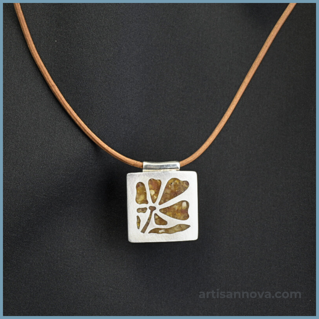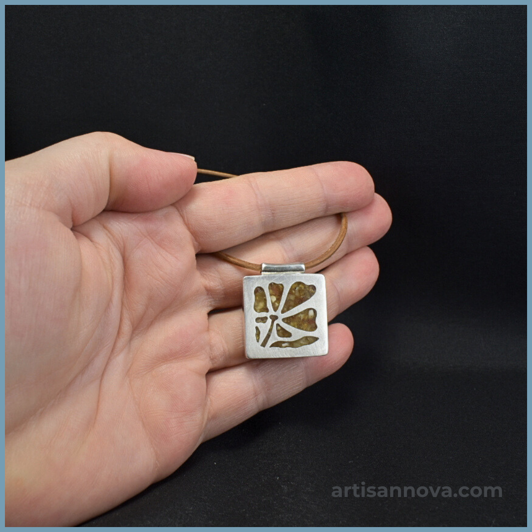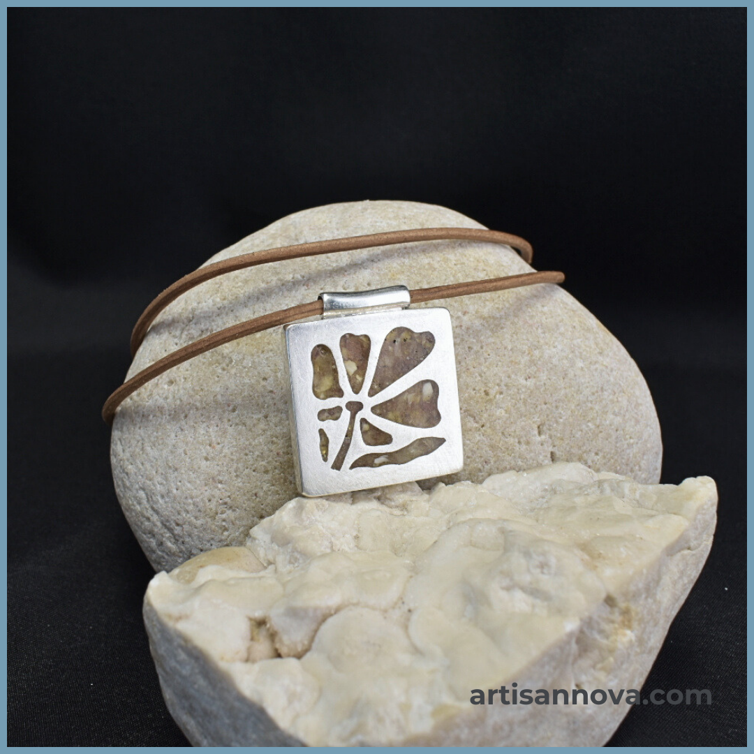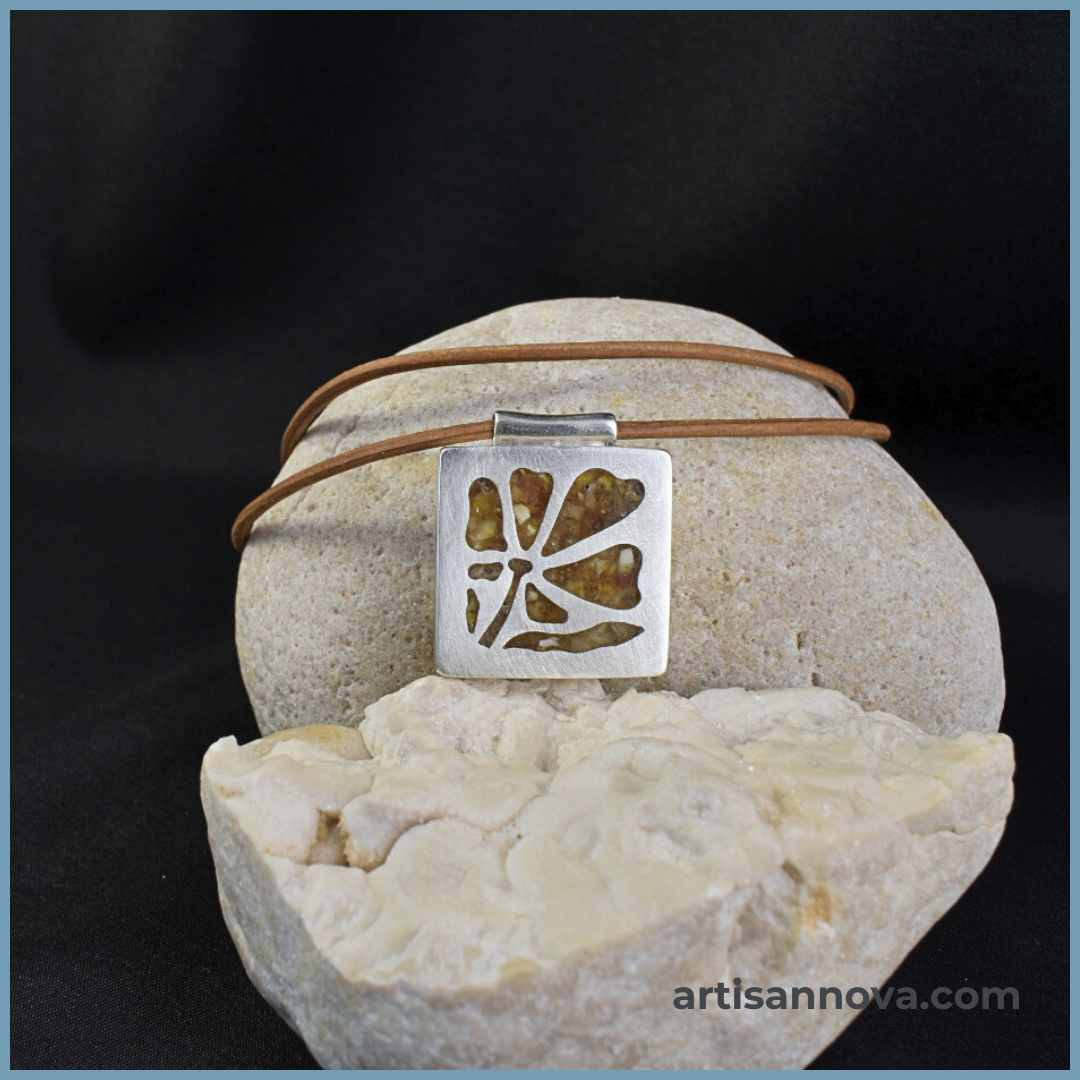 Naszyjnik srebro 925 w formie geometrycznego wisiorka o wyraźnej, zamkniętej konstrukcji. Centralną część wypełnia kruszony bursztyn bałtycki, a całość została zawieszona na rzemieniu z dopasowanym zapięciem.