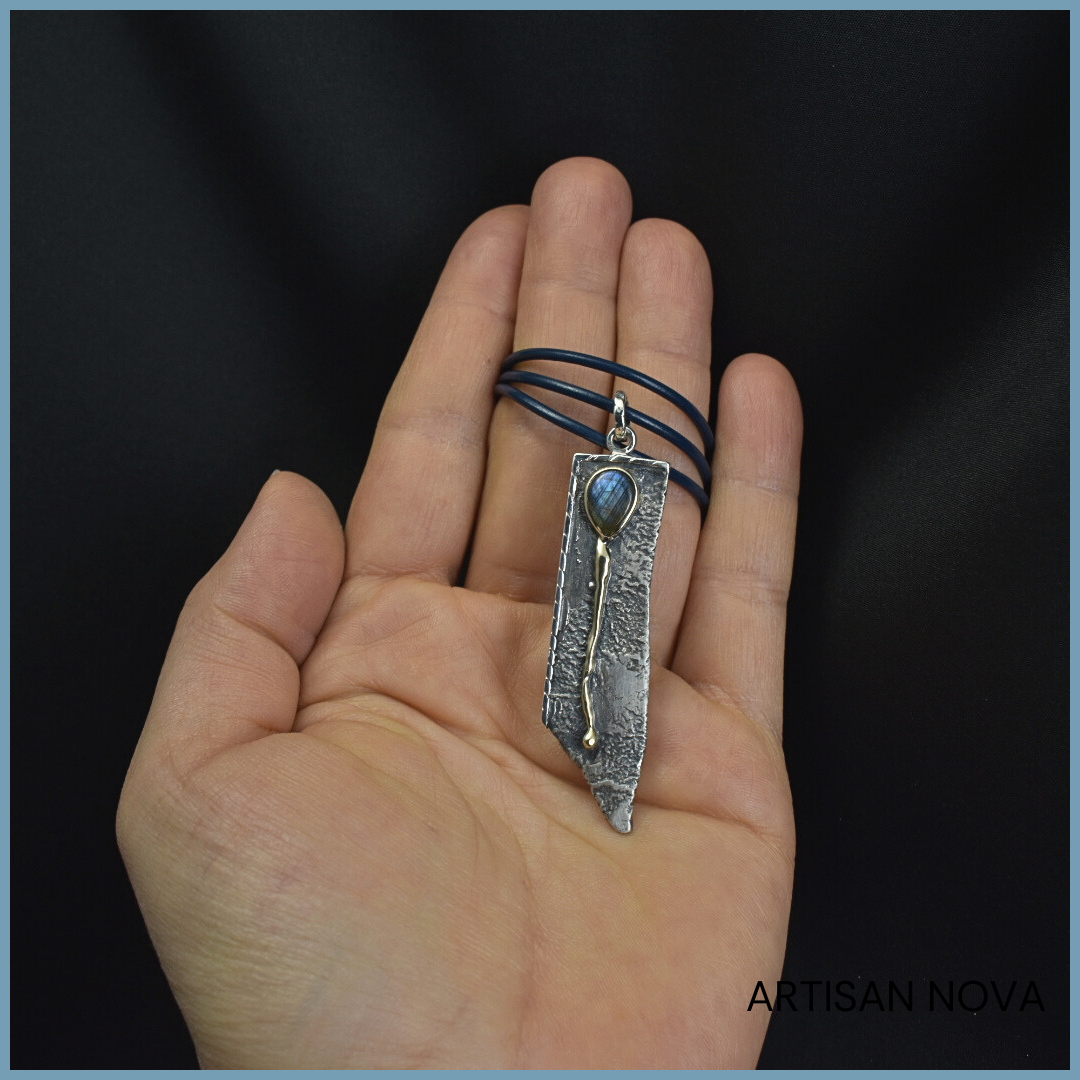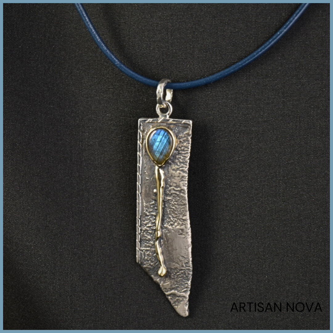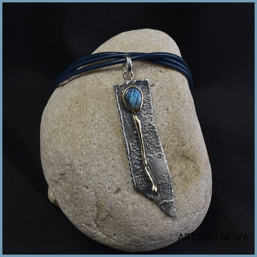 Centralnym elementem jest labradoryt w kształcie odwróconej kropli, oprawiony w złoto, które "spływa" po wisiorku. Kamień wykazuje zmienność barwy w zależności od światła, ujawniając subtelne refleksy i głębię powierzchni. Zestawienie jego gładkiej struktury z nieregularną formą srebra porządkuje kompozycję i kieruje uwagę ku centralnej części.
