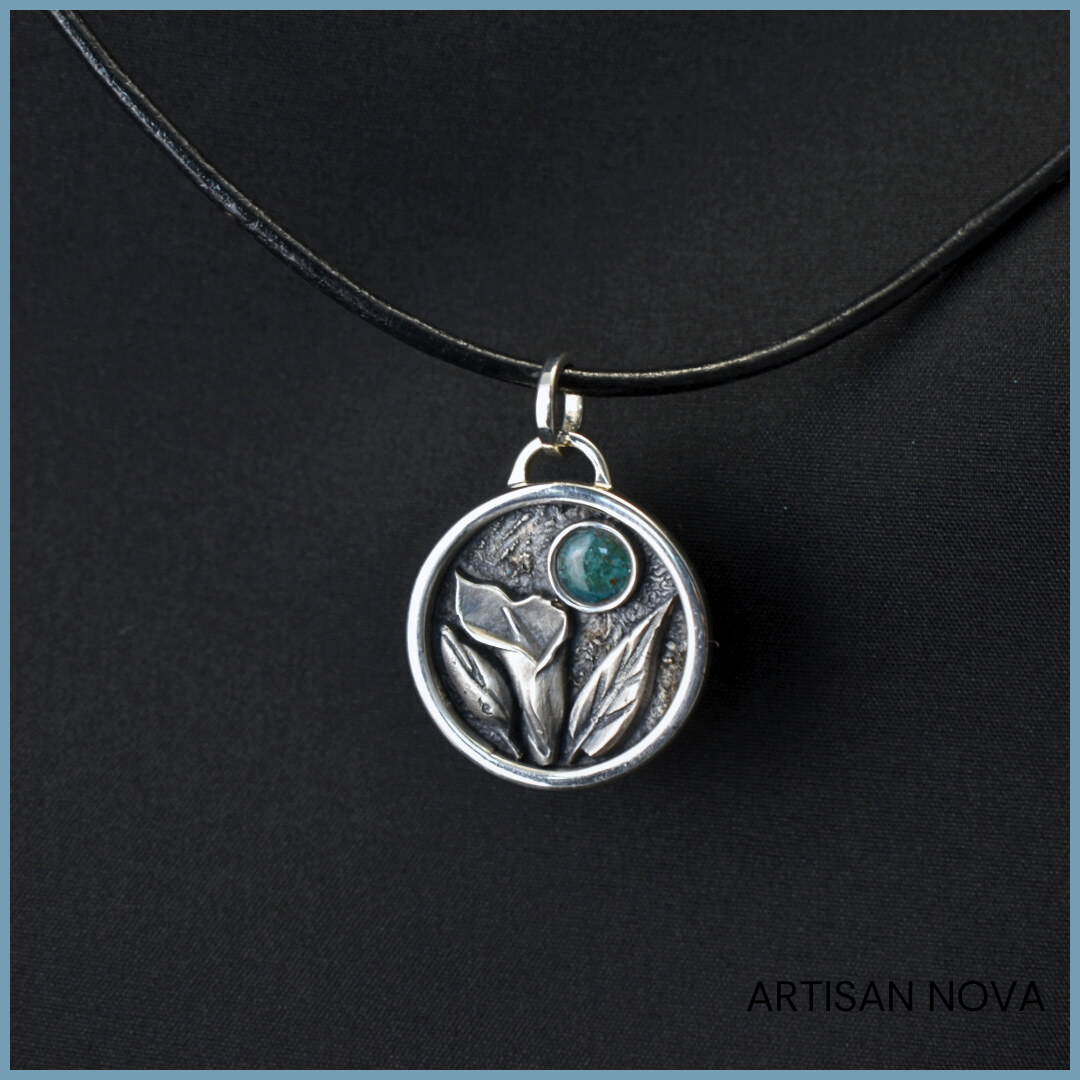 Naszyjnik srebro 925 w formie okrągłego wisiorka o kontrastowej, oksydowanej fakturze. Centralnym elementem jest kupryt oraz motyw lilii osadzony w powierzchni formy.