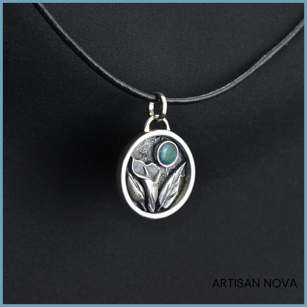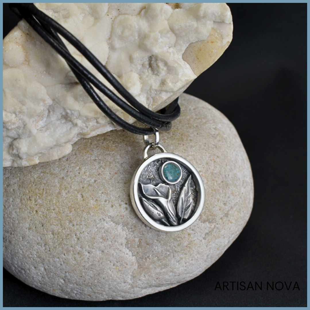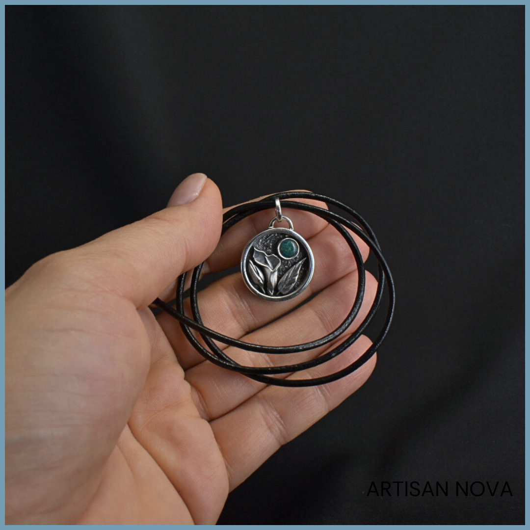 Wisiorek został wykonany ręcznie ze srebra próby 925. Zewnętrzna część oprawy wykończona jest w wysokim połysku, natomiast wnętrze posiada oksydowaną, fakturowaną powierzchnię, która wprowadza głębię i kontrast tonalny.