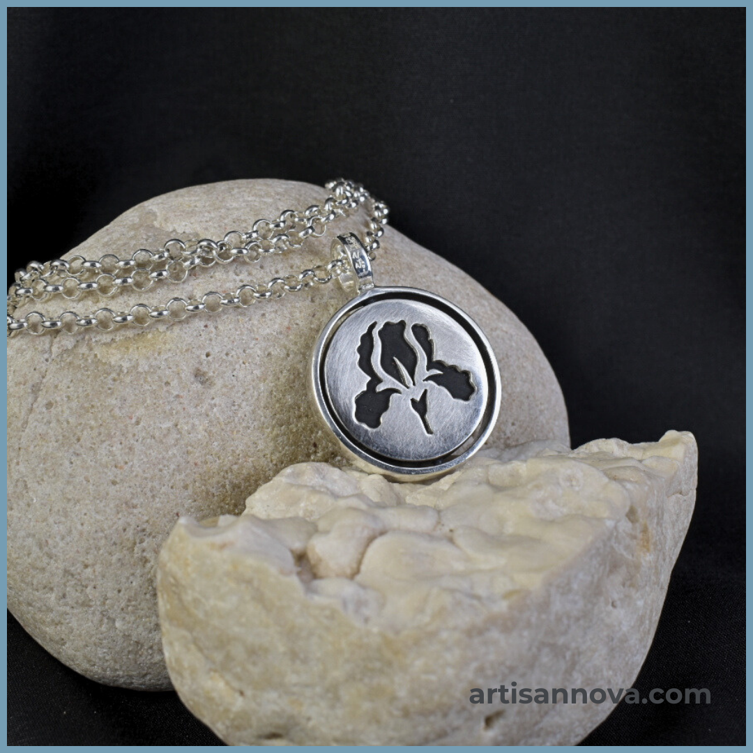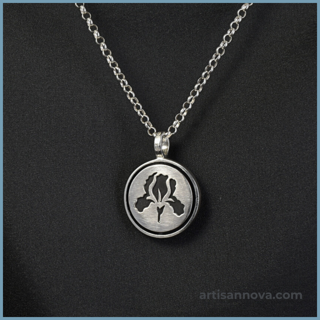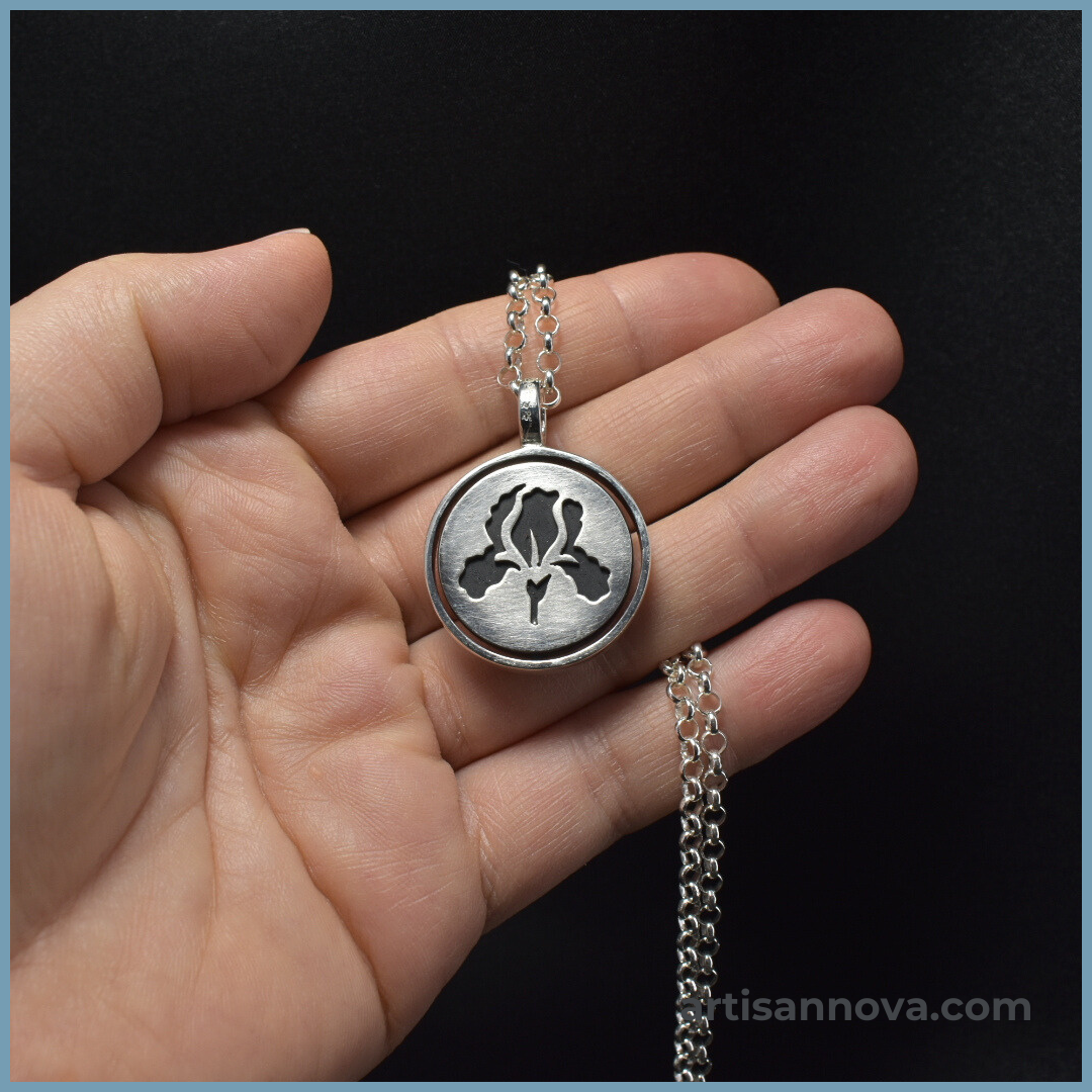 Naszyjnik srebro 925 z czarnym turmalinem. Dwustronny wisiorek z motywem irysa został zawieszony na srebrnym łańcuszku.