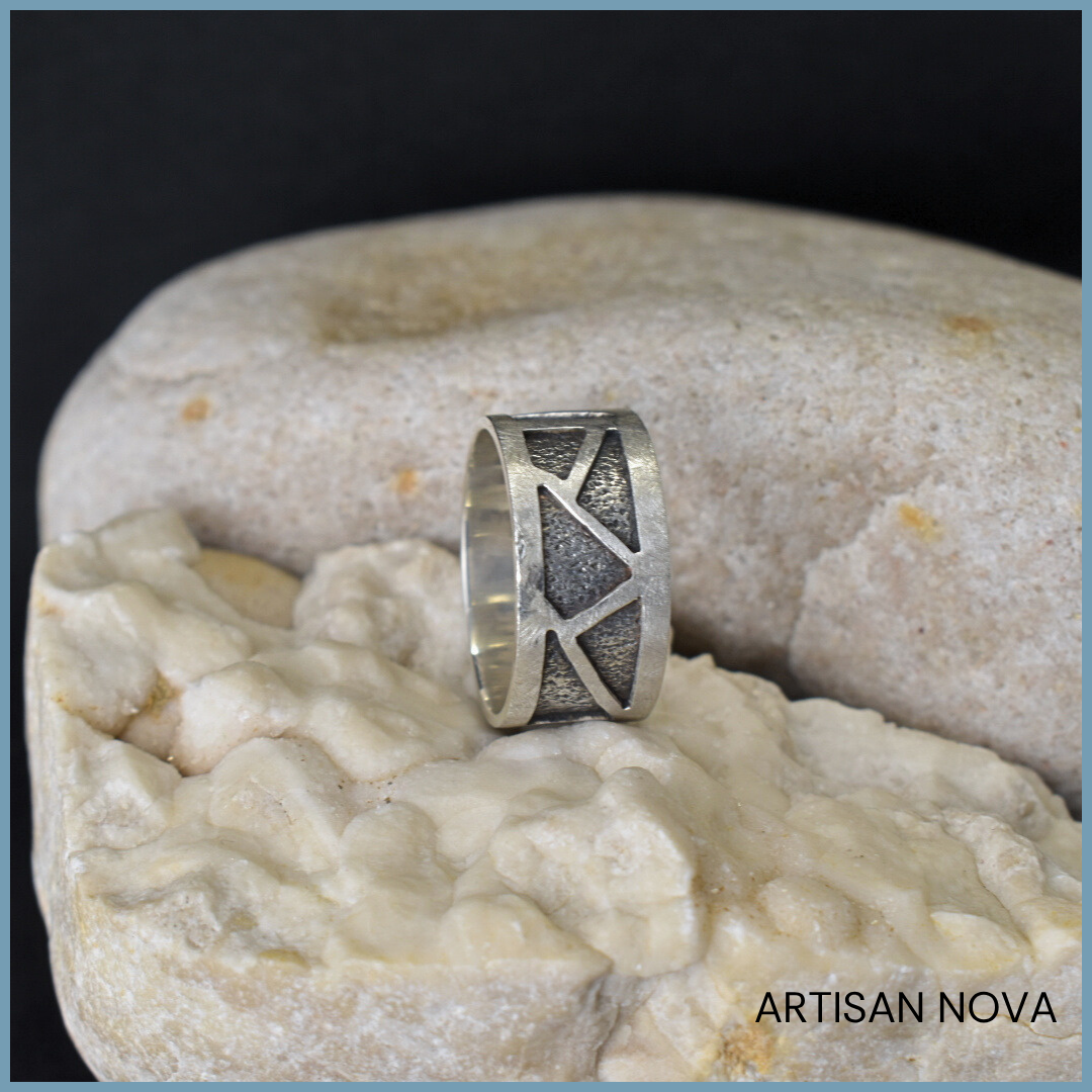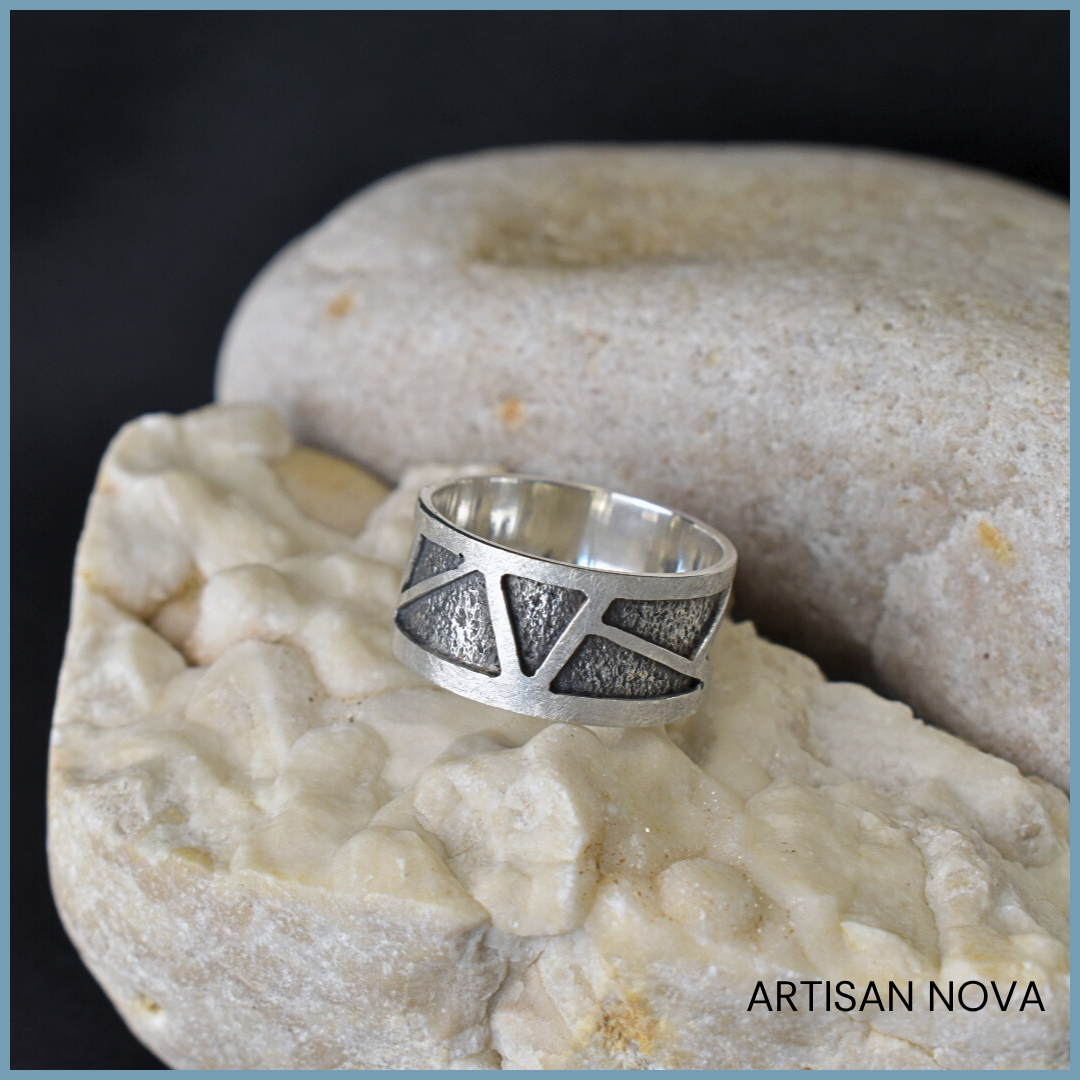 Pierścionek obrączka srebro 925 o szerokiej formie i geometrycznym wzorze z satynowym wykończeniem. Oksydowane, fakturowane wnętrze podkreśla strukturę powierzchni rozmiar 15