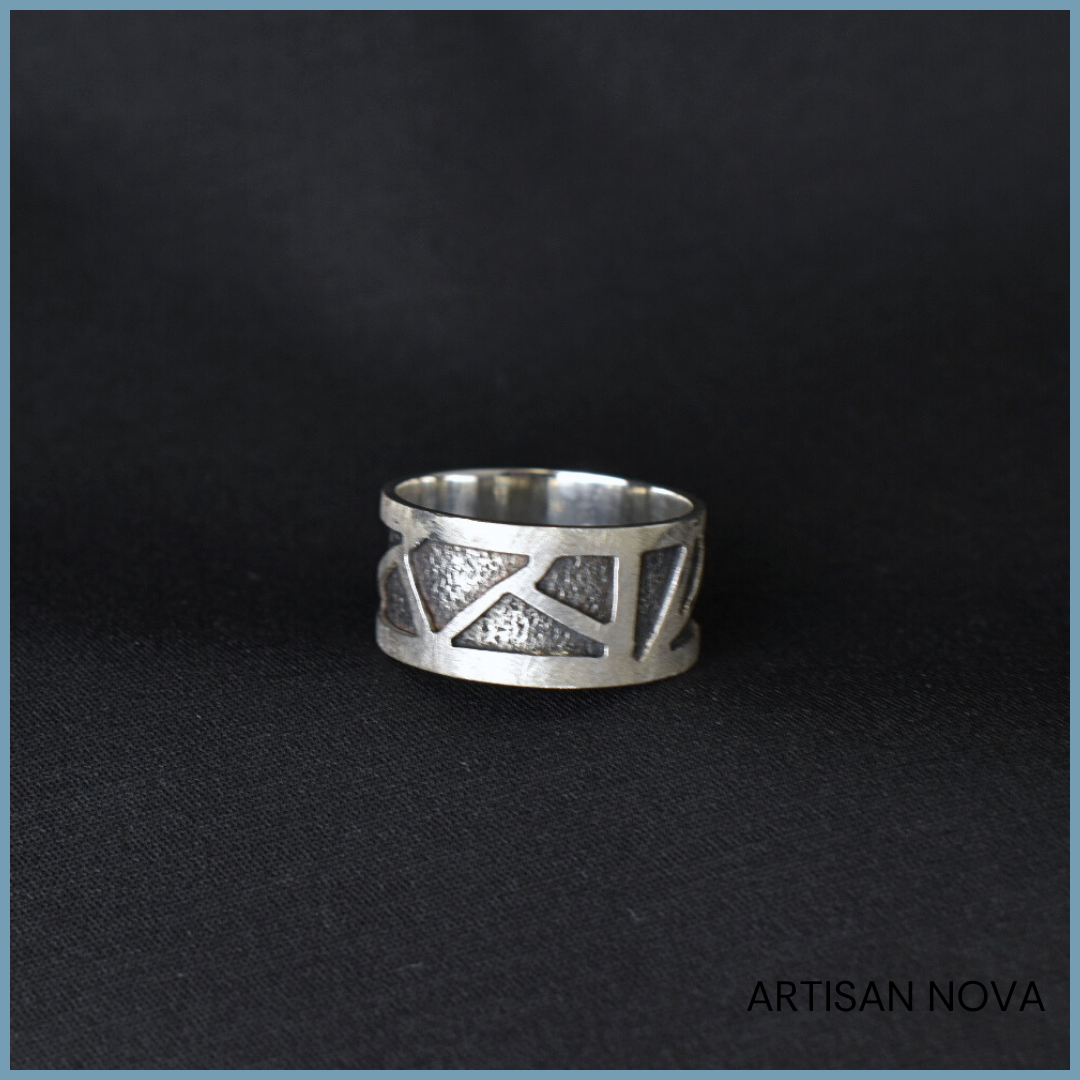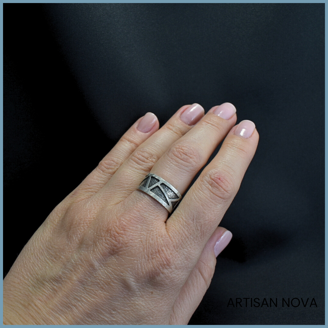 Na powierzchni obrączki znajduje się geometryczny wzór wycięty w metalu. Wnętrze wzoru wypełnia oksydowana i fakturowana struktura, która wprowadza wyraźny kontrast tonalny. Zestawienie jasnego srebra z ciemniejszym wypełnieniem podkreśla rytm kompozycji i nadaje jej głębię.