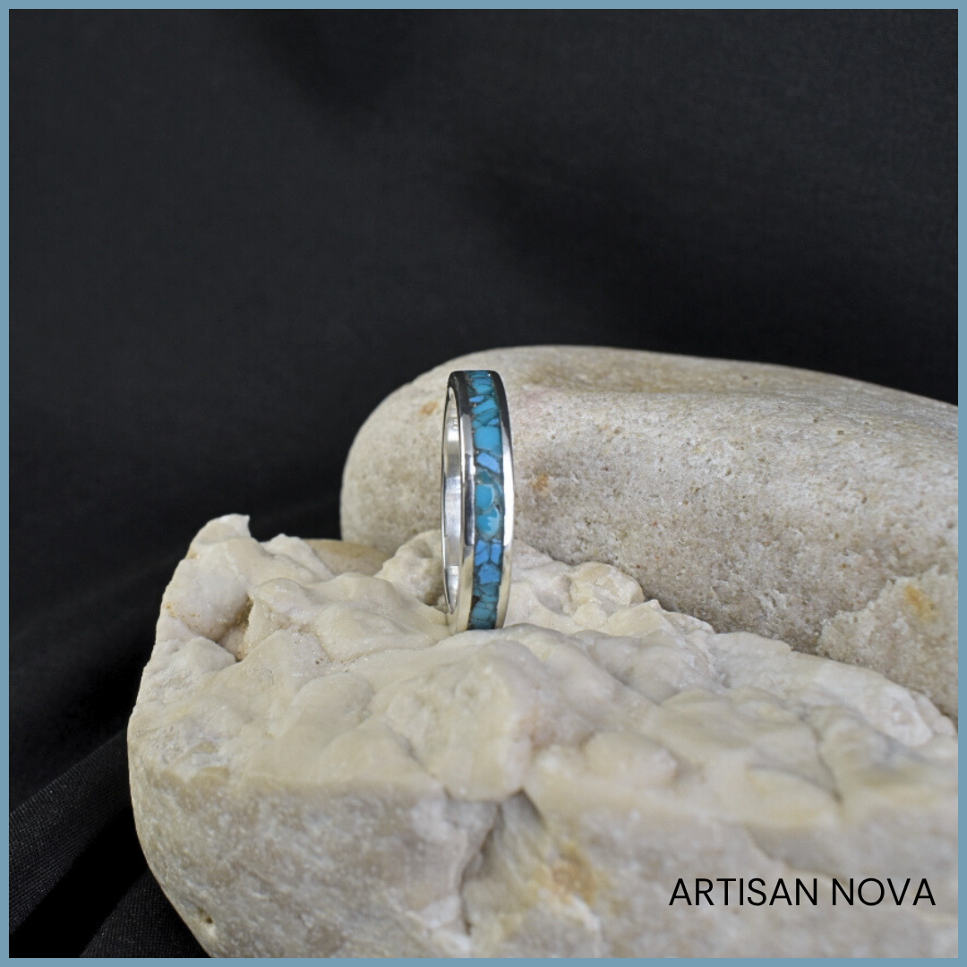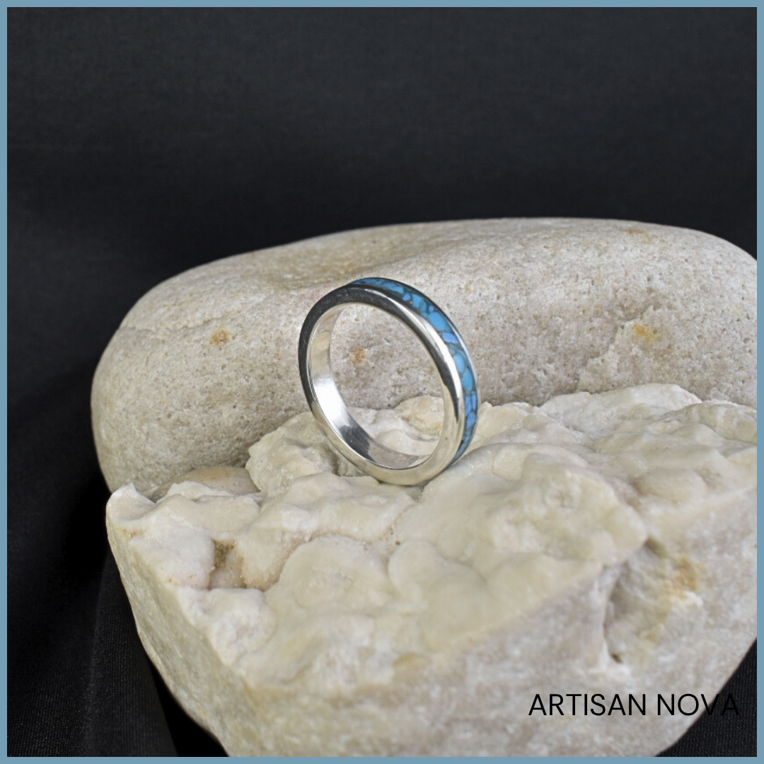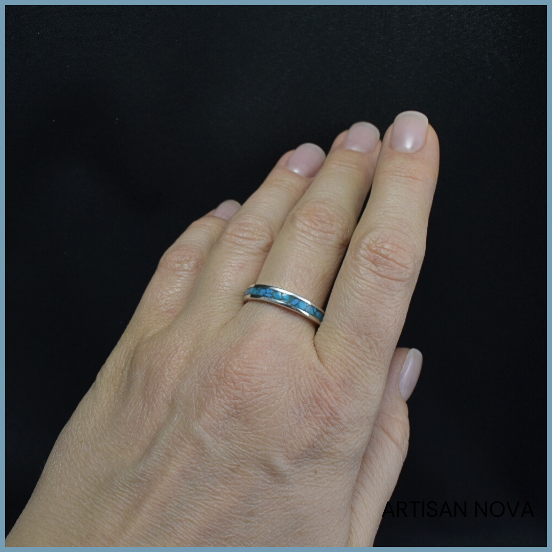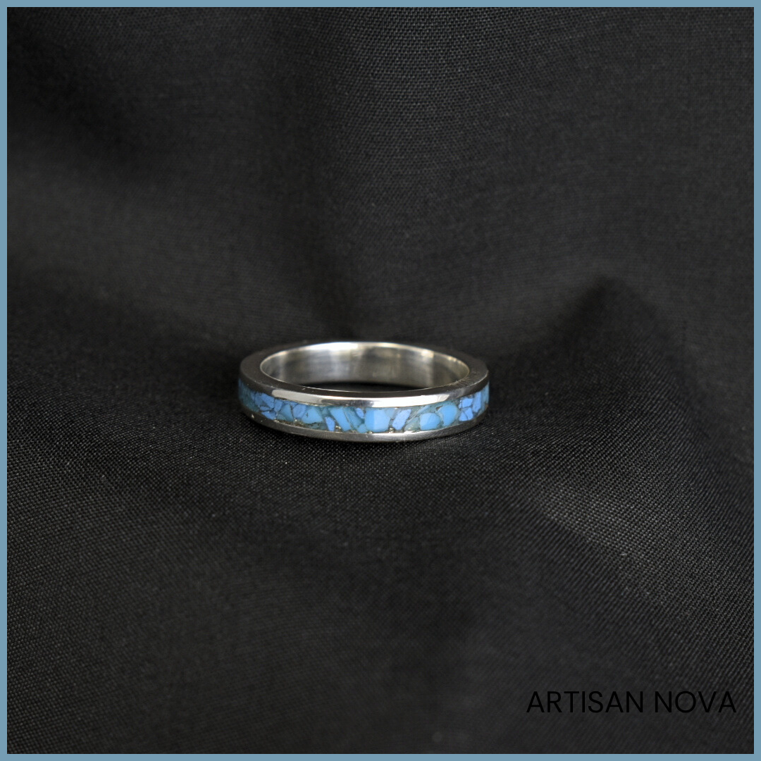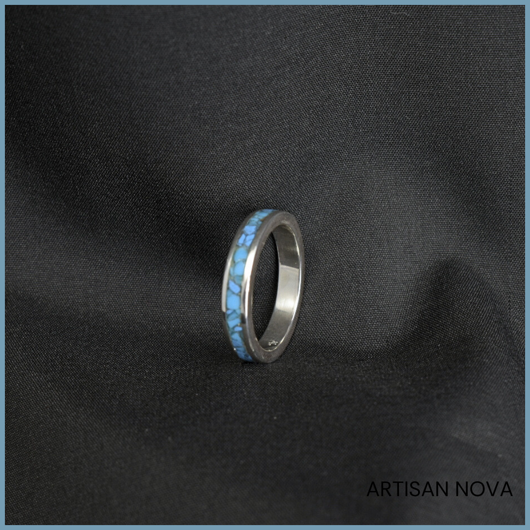 Wnętrze obrączki wypełniono kruszonym turkusem oraz turkusem z Armenii, które zostały zabezpieczone warstwą polimeru, tworząc jednolitą i gładką powierzchnię. Kamień układa się w nieregularną strukturę widoczną wewnątrz formy, wprowadzając kontrast pomiędzy uporządkowaną linią srebra a bardziej organicznym układem materiału.