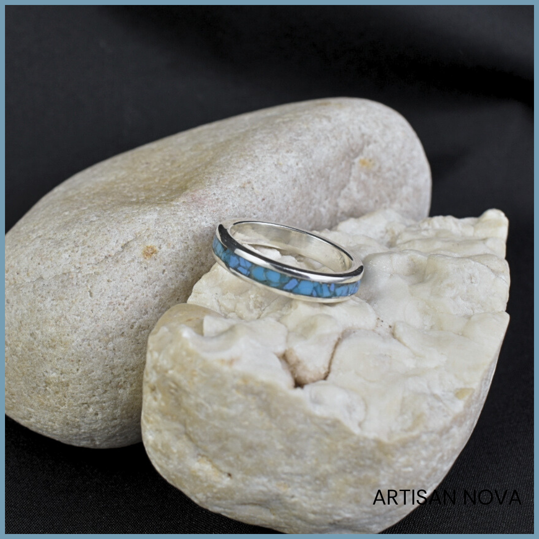 Pierścionek srebro 925 w formie minimalistycznej obrączki o gładkiej, polerowanej powierzchni. Wnętrze wypełnia kruszony turkus o nieregularnej strukturze, a rozmiar 15,5
