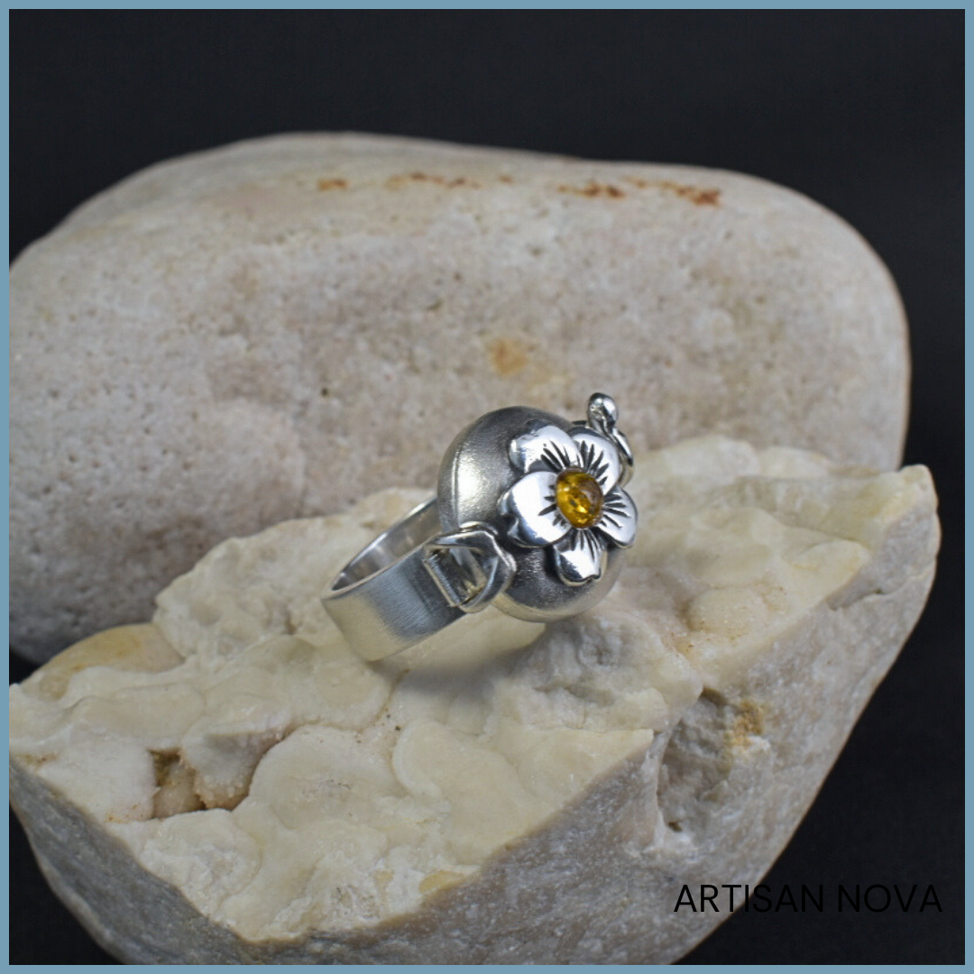 Pierścionek srebro 925 w formie otwieranego sekretnika o satynowej obrączce i dekoracyjnym motywie kwiatu. Centralnym elementem jest bursztyn bałtycki rozmiar 15