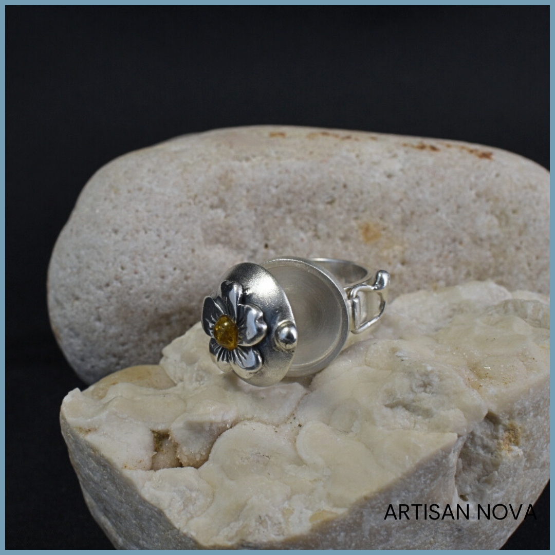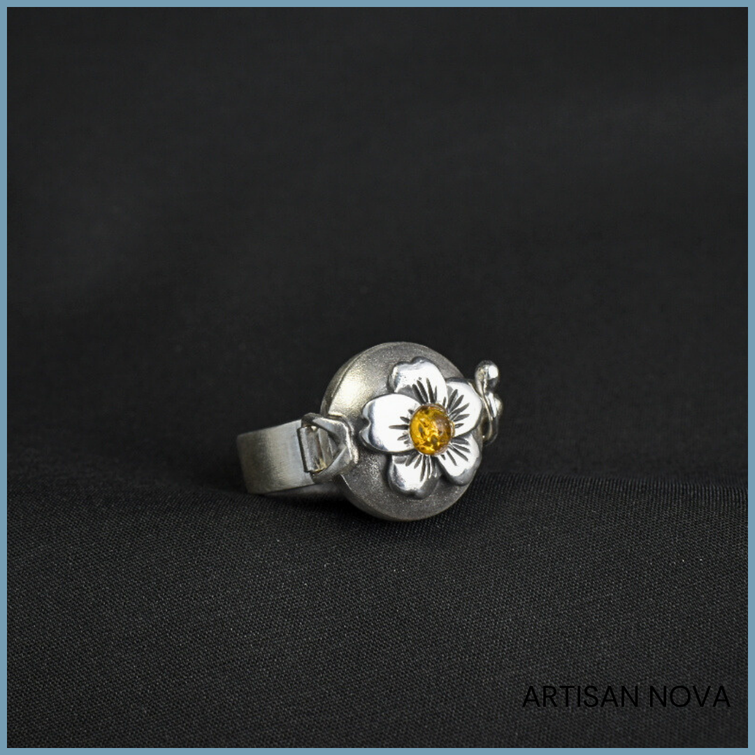 Pierścionek srebro 925 z bursztynem bałtyckim w formie otwieranego sekretnika z motywem kwiatowym, w rozmiarze 15.