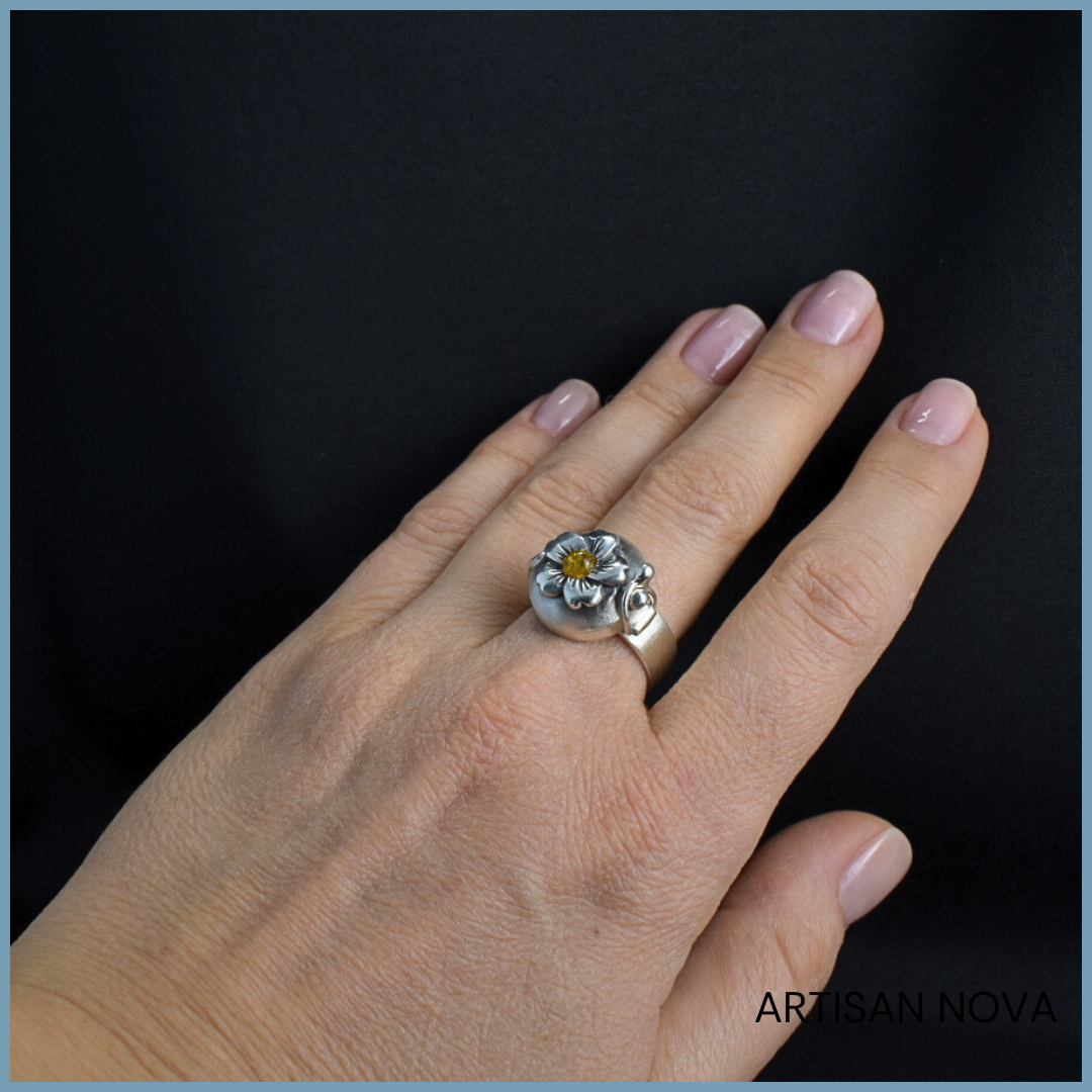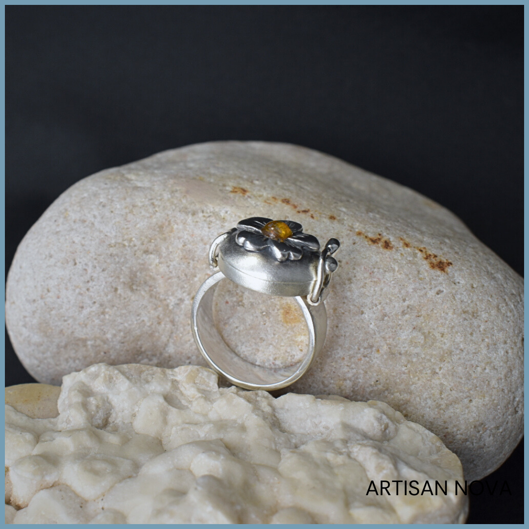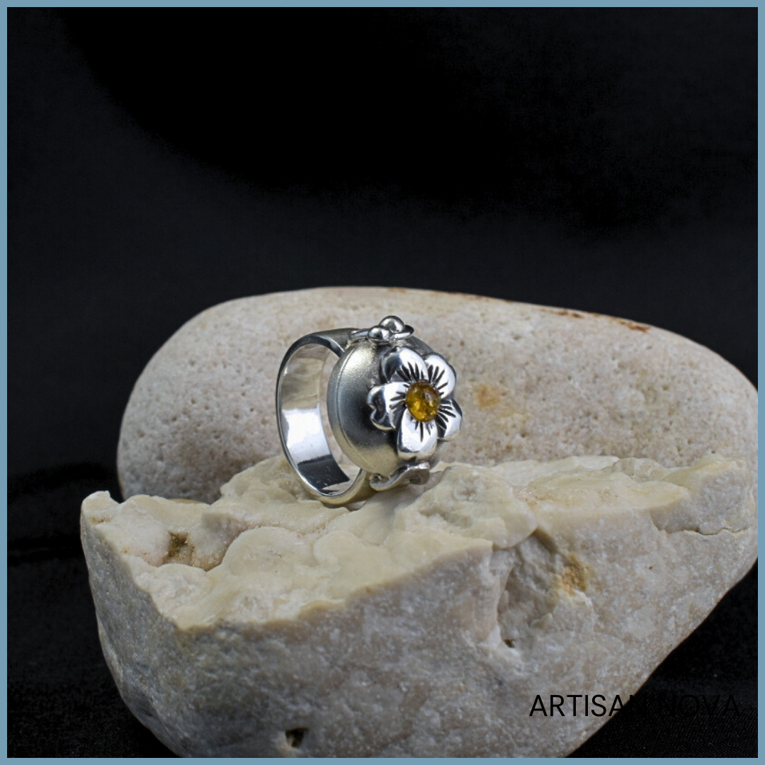 Górną część zdobi polerowany motyw kwiatu, który kontrastuje z satynową powierzchnią obrączki. W centralnym punkcie osadzony jest bursztyn bałtycki o ciepłej, żółtej barwie. Powierzchnia kamienia delikatnie odbija światło, wprowadzając subtelne zróżnicowanie tonalne.