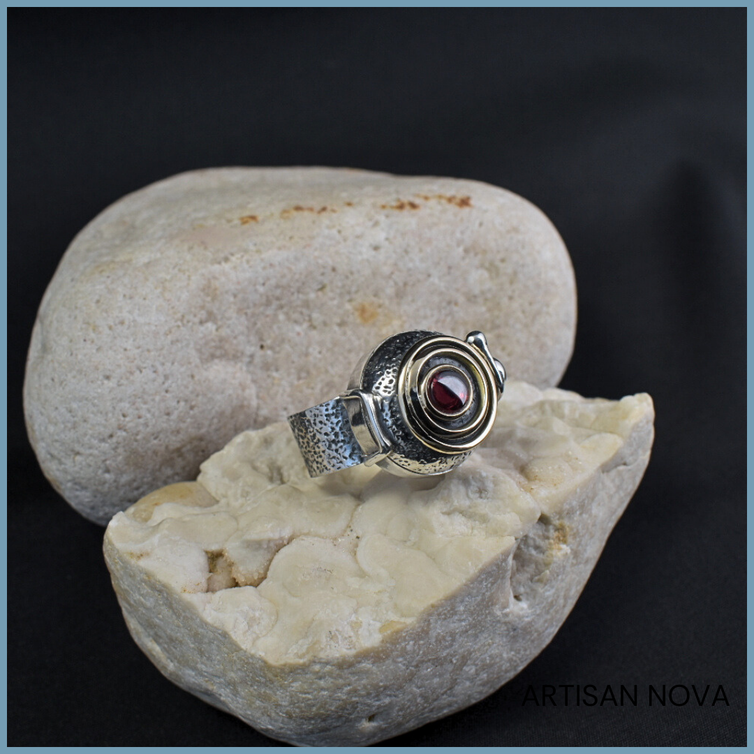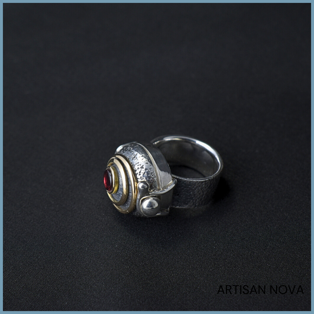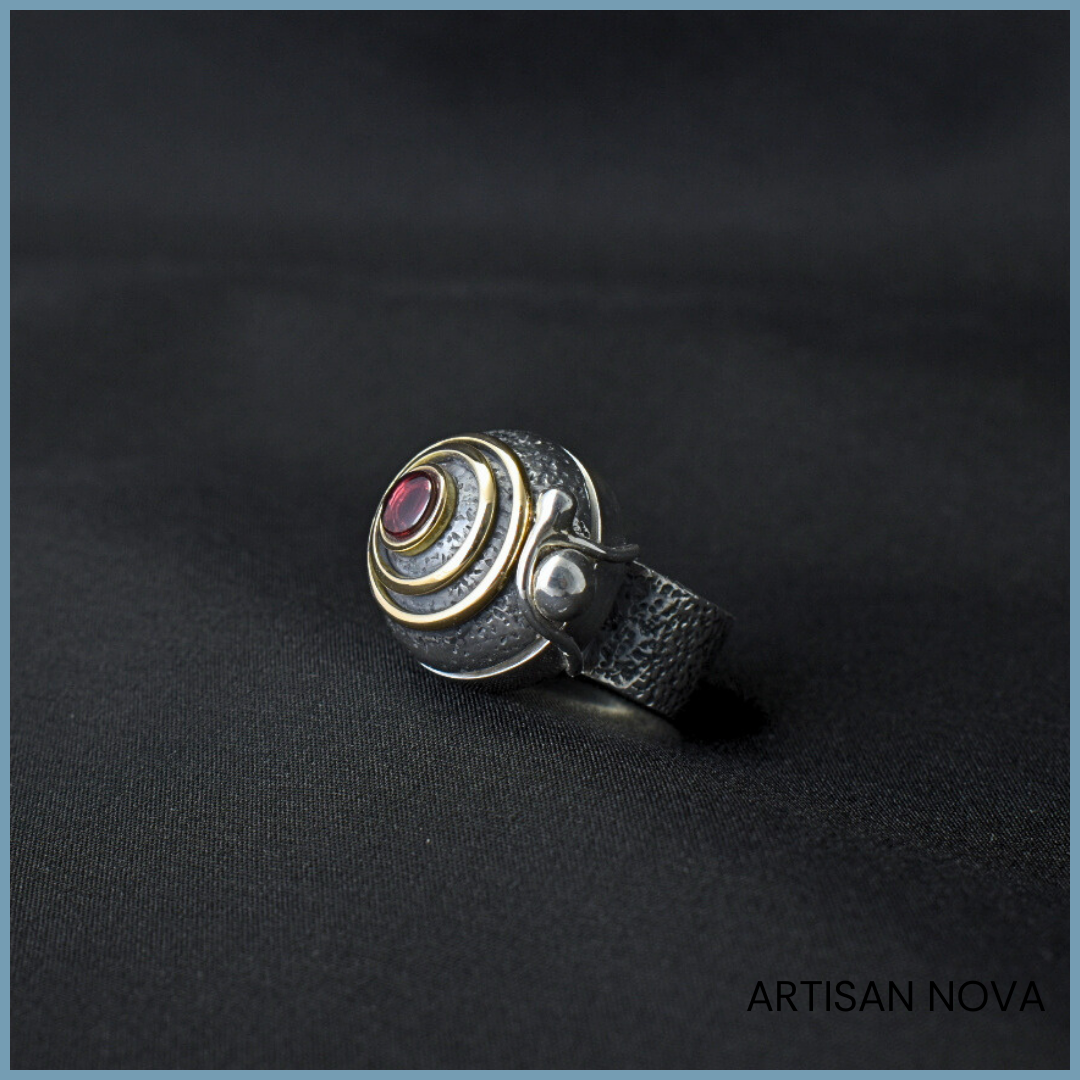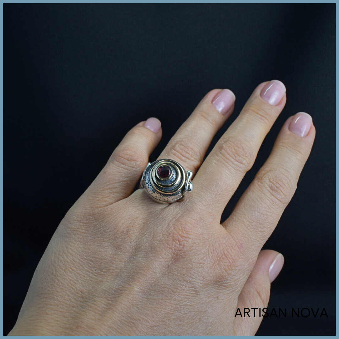Pierścionek srebro 925 w formie otwieranego sekretnika o wyraźnej, geometrycznej konstrukcji z dodatkiem złota. Centralnym elementem jest granat osadzony w koncentrycznej strukturze rozmiar 12