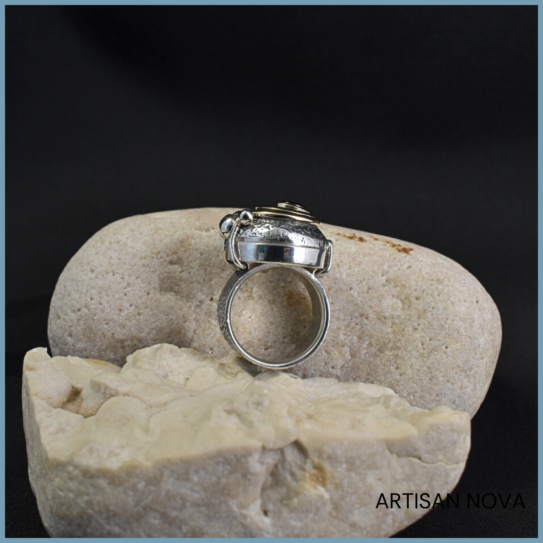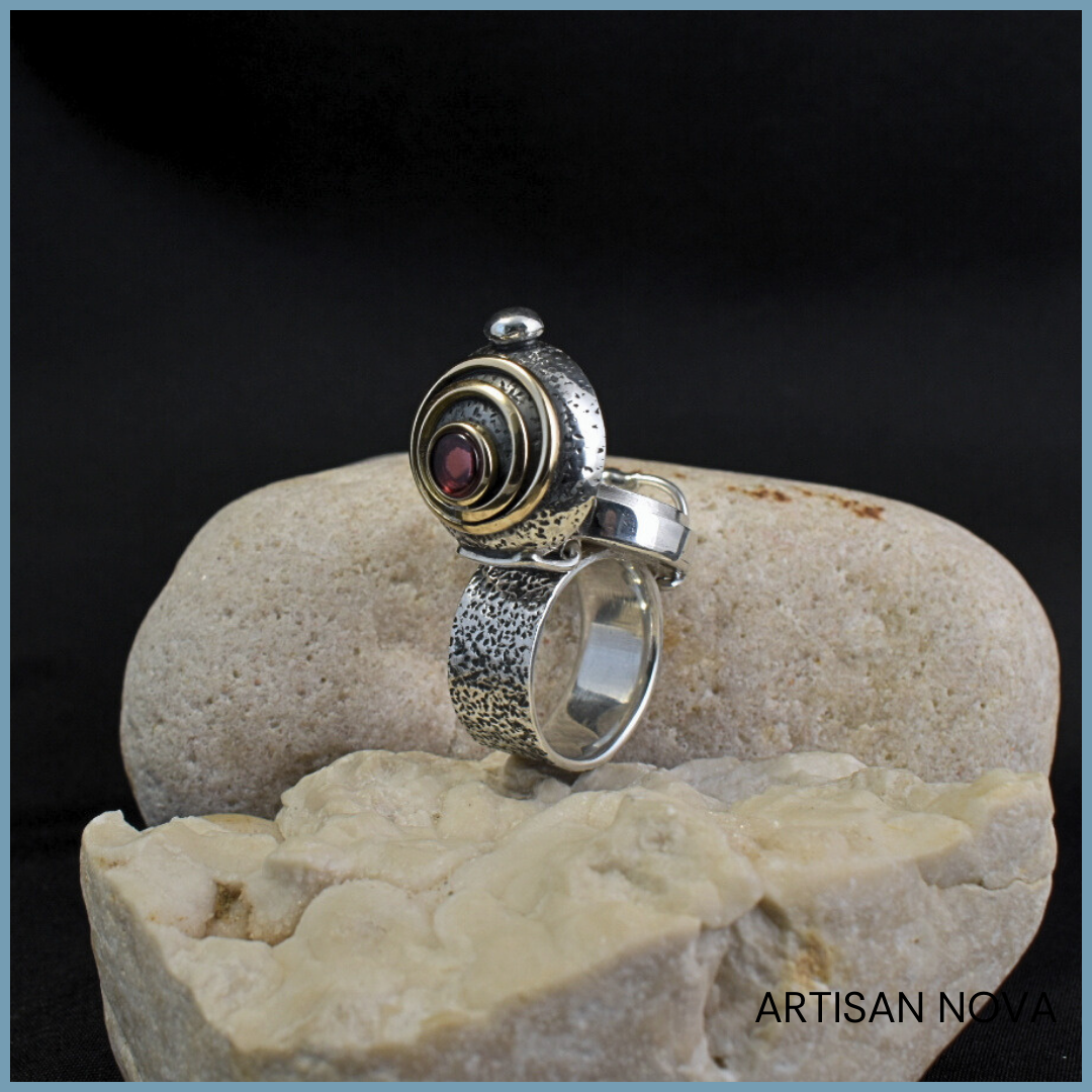 Pierścionek srebro 925 z granatem w formie otwieranego sekretnika z elementami złota i geometryczną strukturą, w rozmiarze 12.