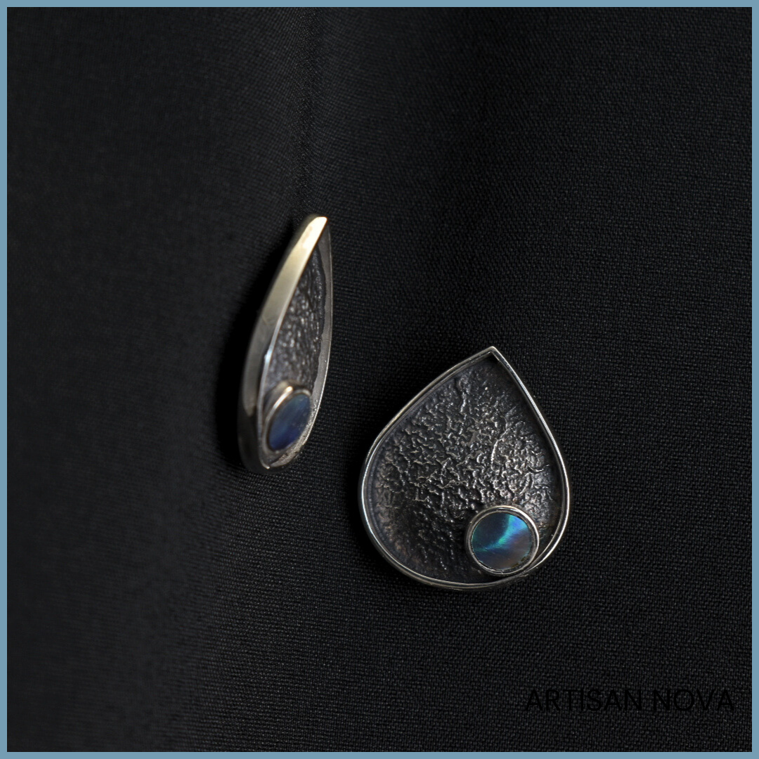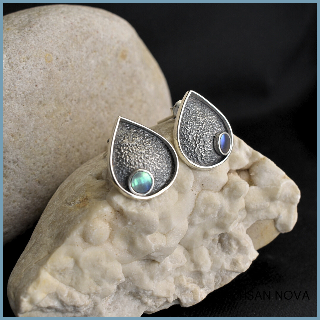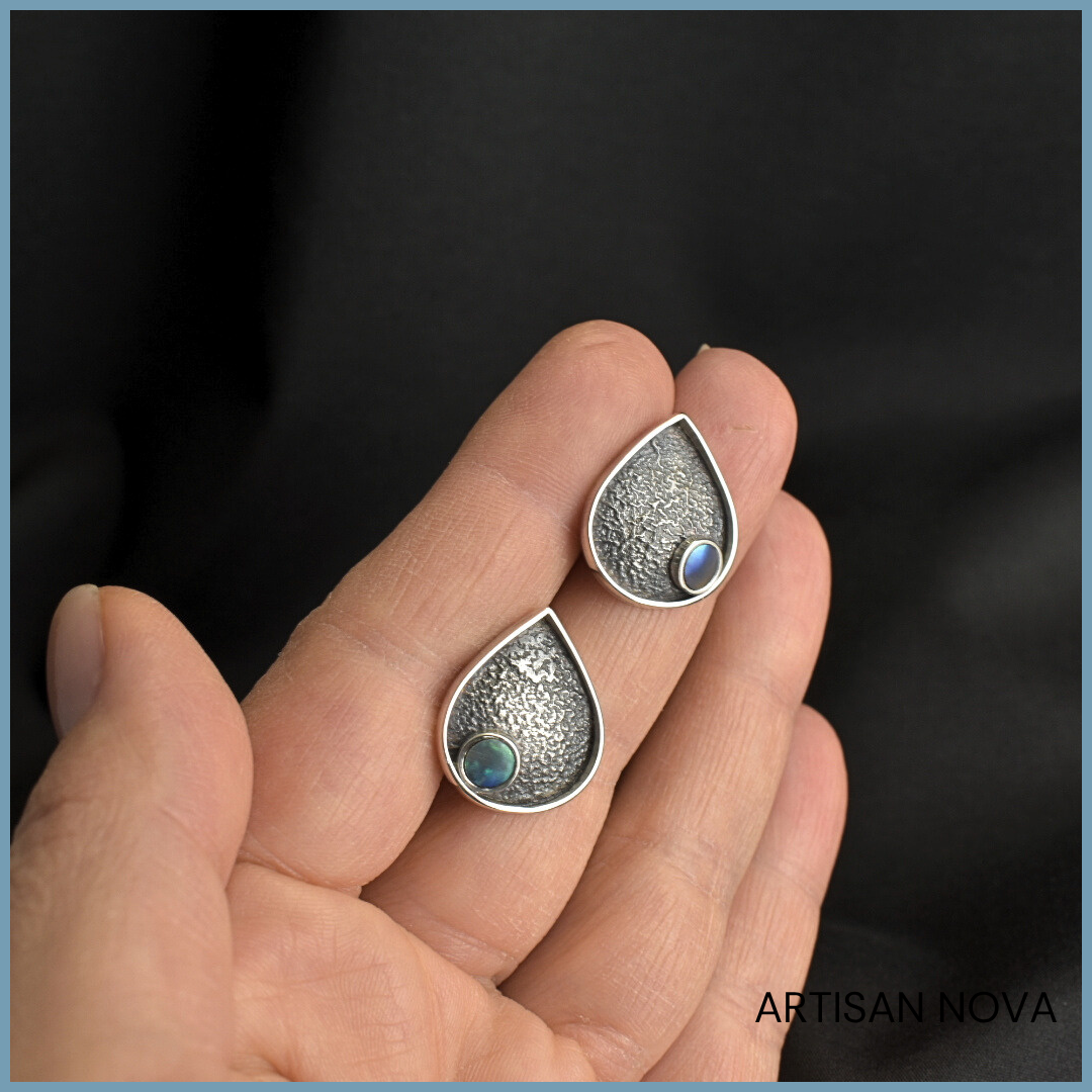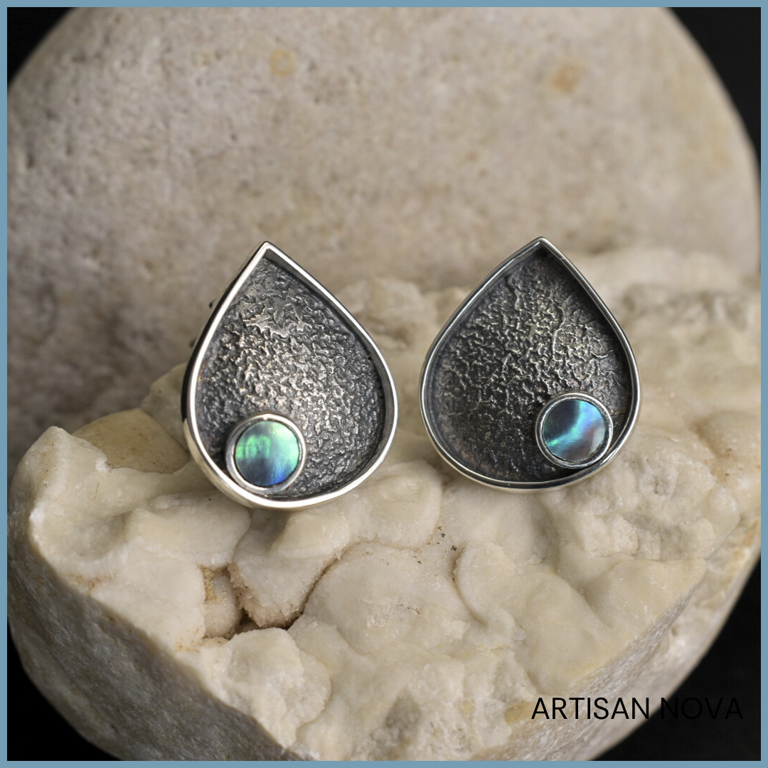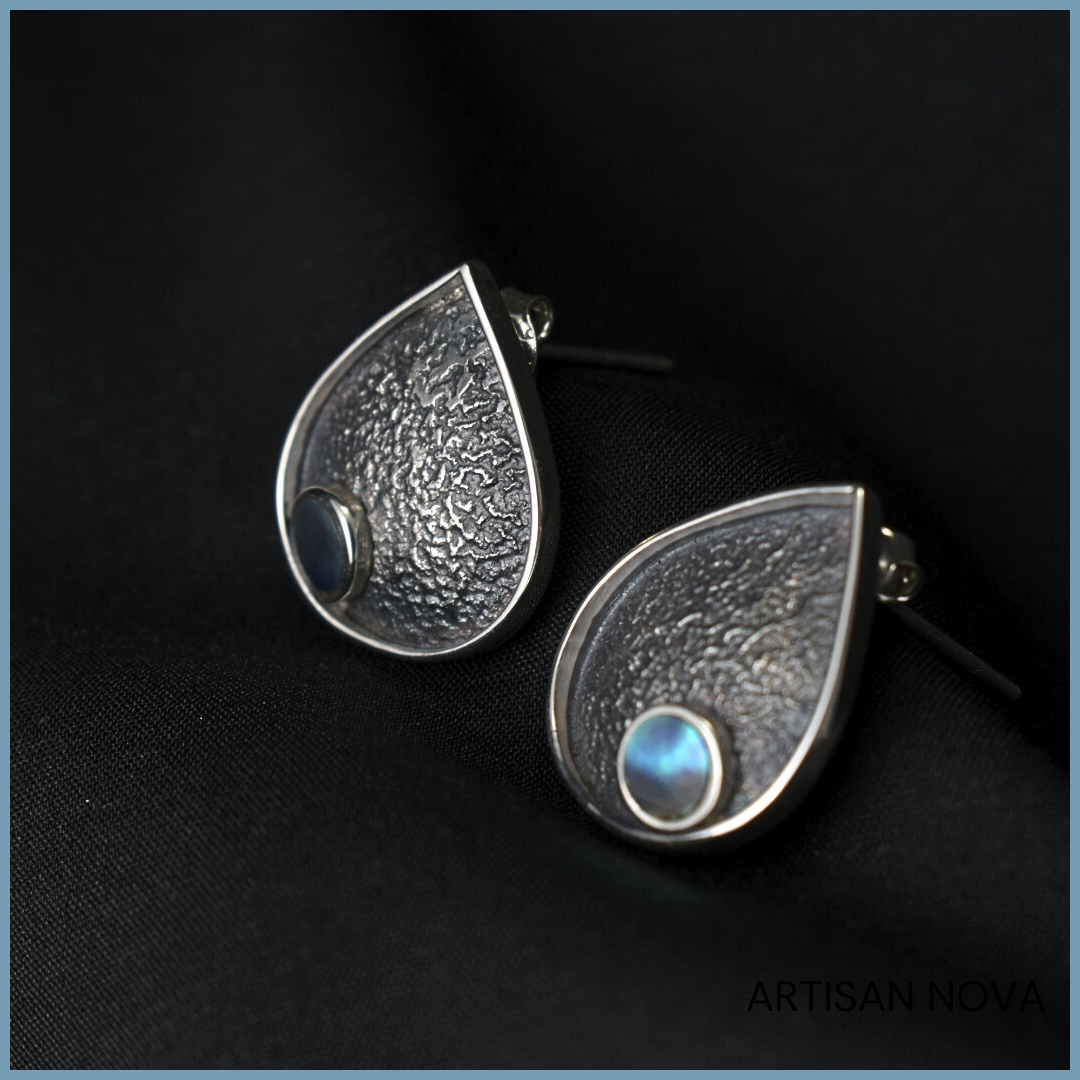 Kolczyki srebro 925 w formie kropli o oksydowanej, surowej fakturze. W centralnej części znajduje się opalizująca muszla, która odbija światło subtelnymi refleksami.