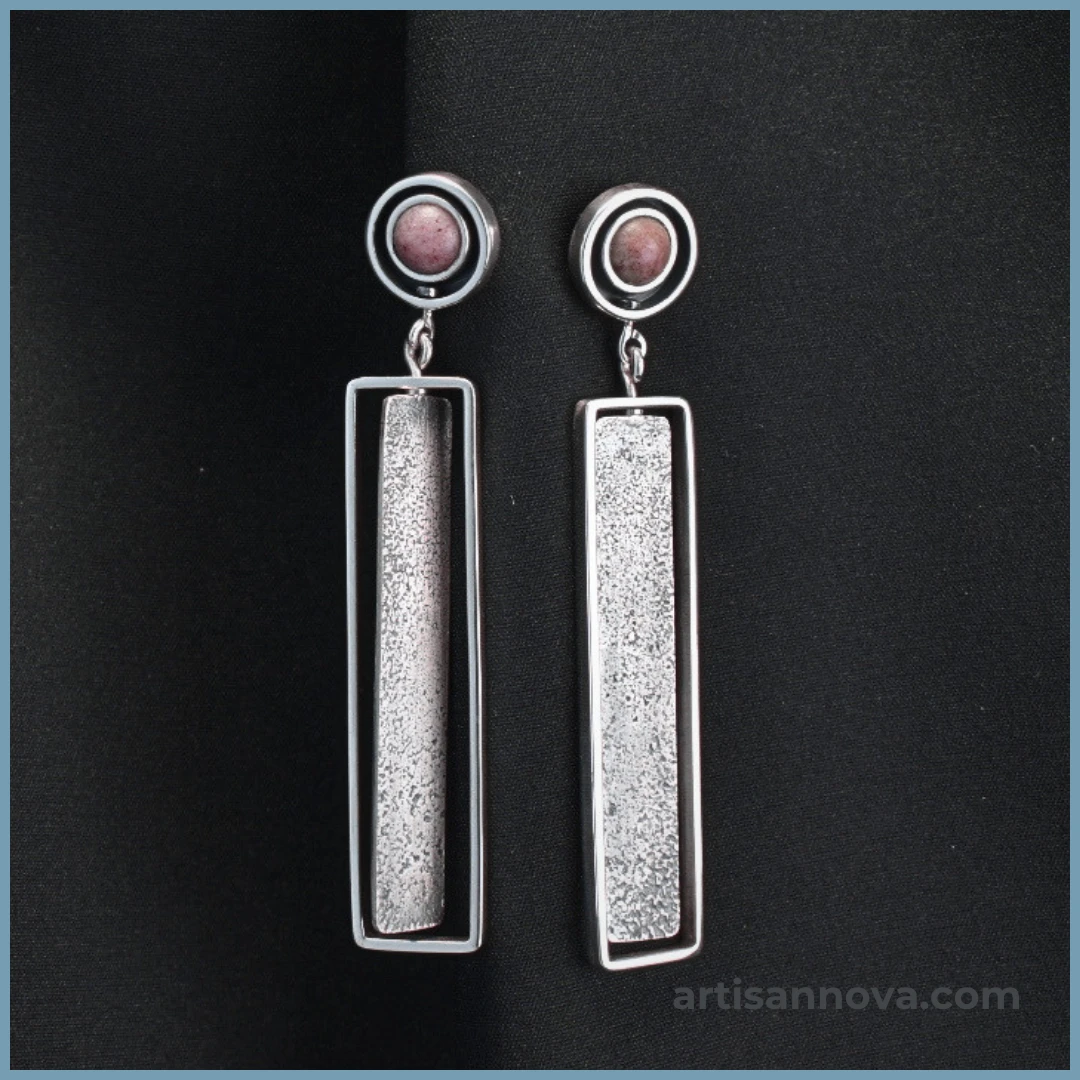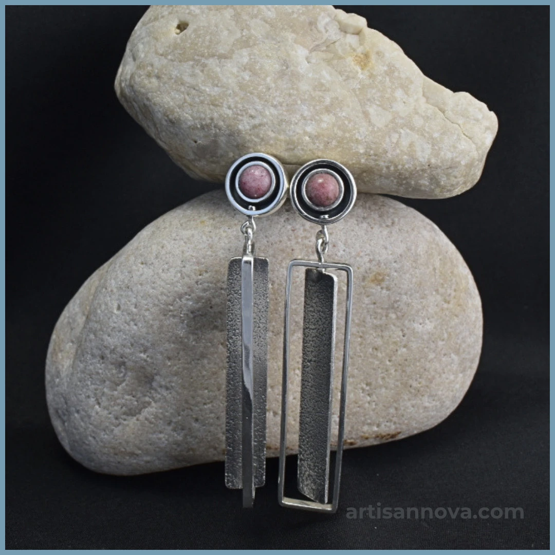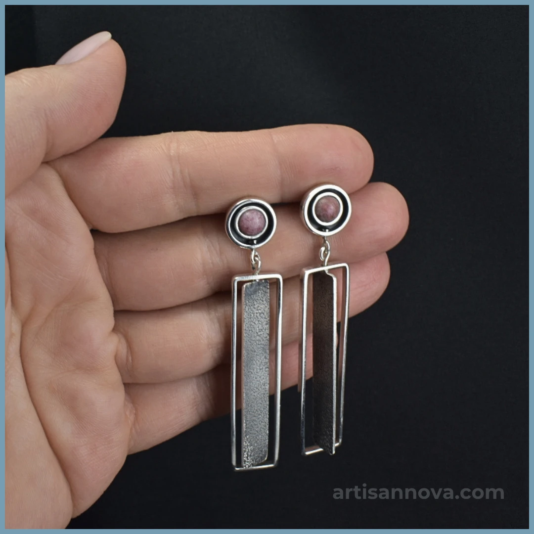 Kolczyki srebro 925 z thulitem o wydłużonej, geometrycznej formie z ruchomą konstrukcją, wykonane ręcznie jako pojedynczy egzemplarz w pracowni jubilerskiej.