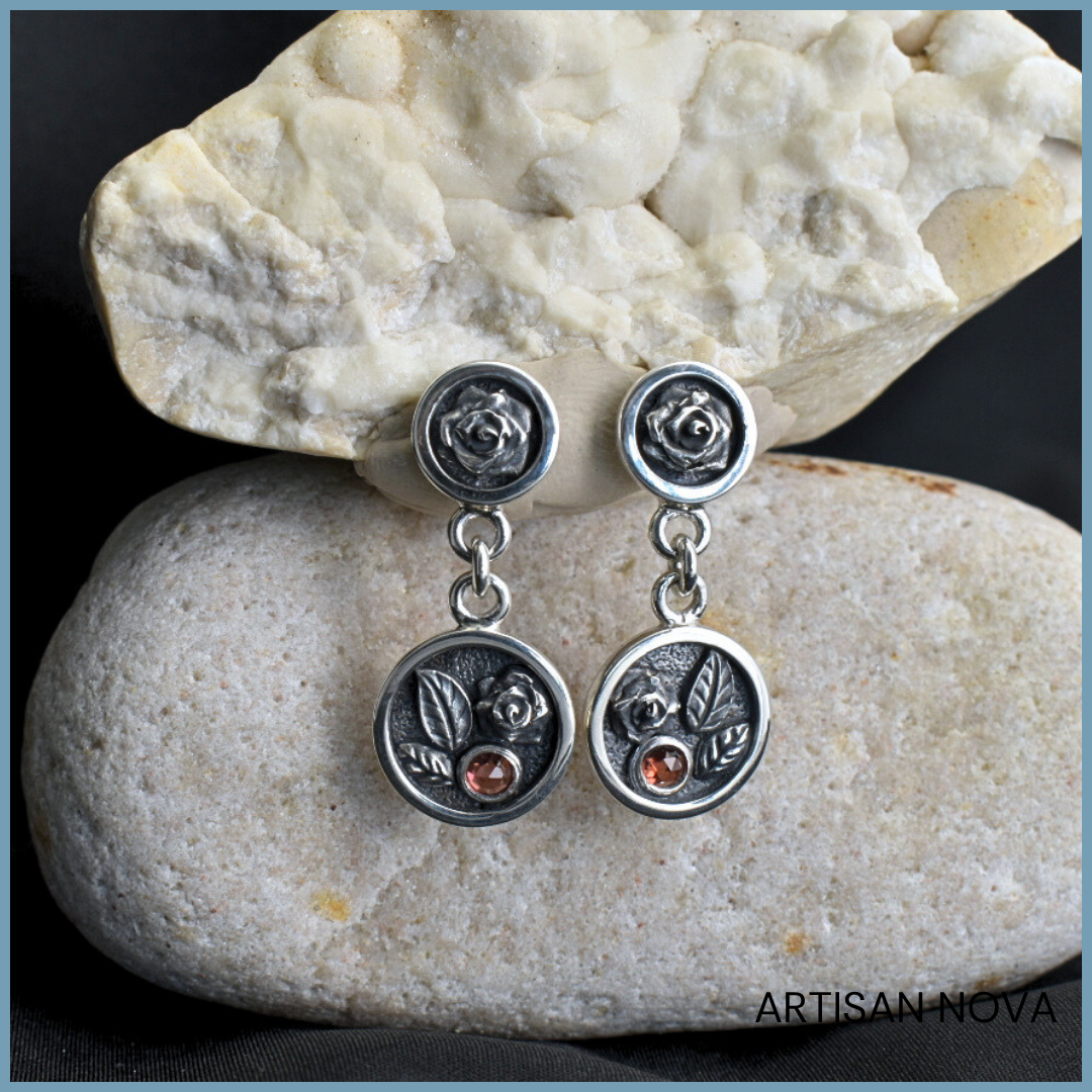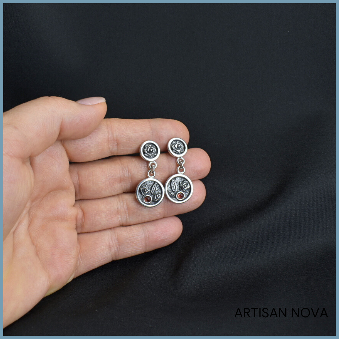 Kolczyki ze srebra 925 z różami i Granatem ROSE GARNET