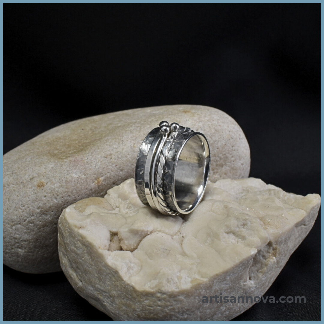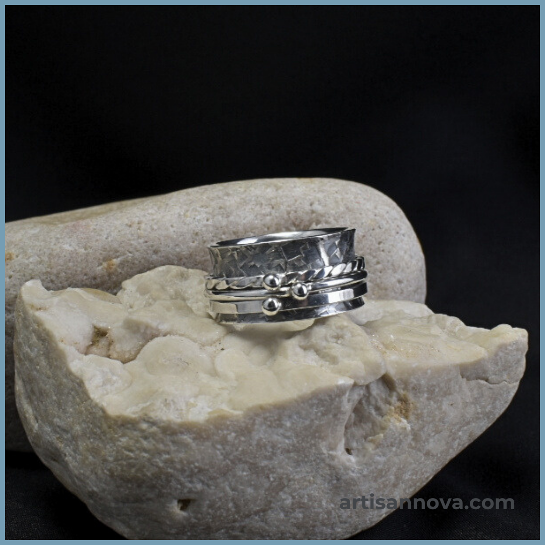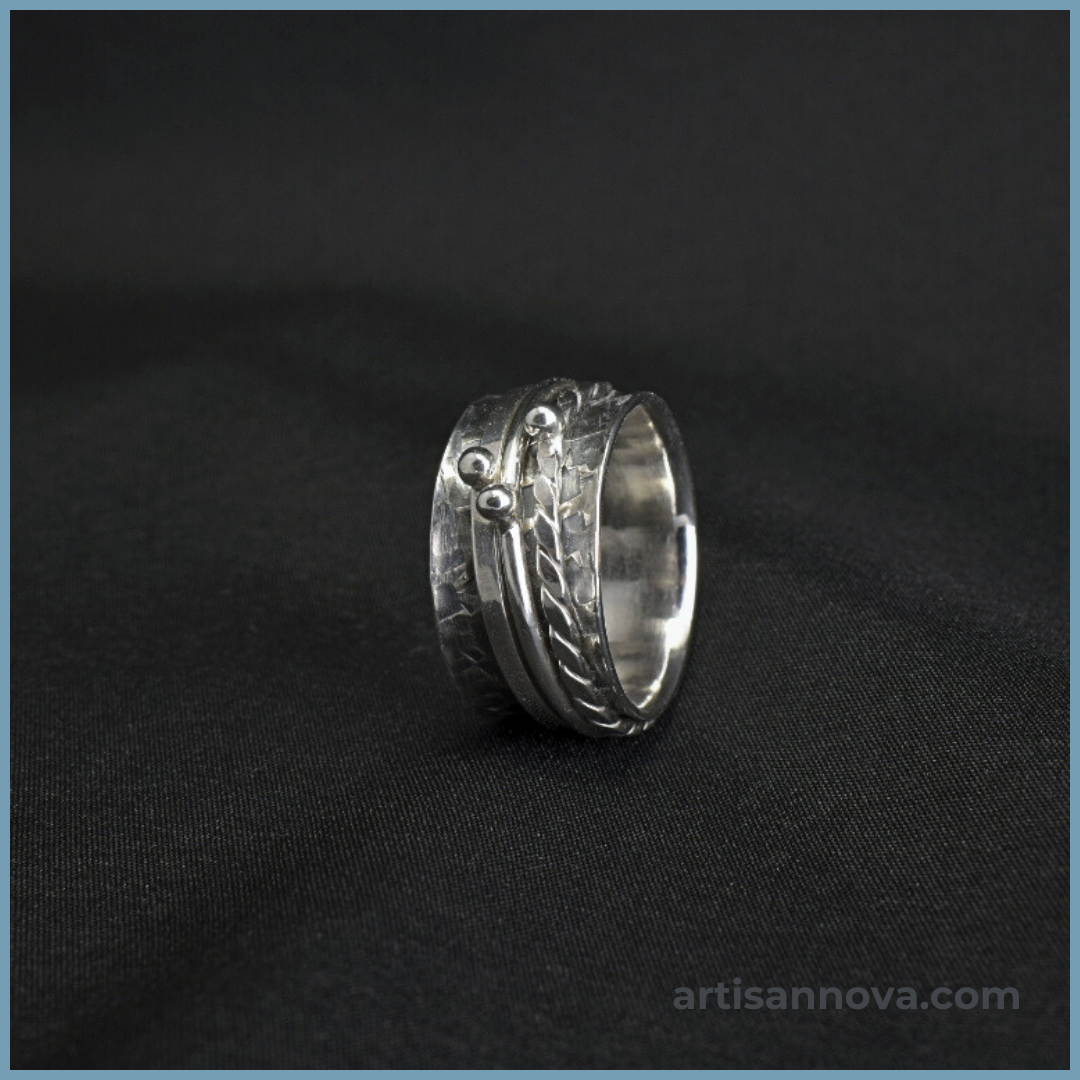 Pierścionek srebro 925 w formie szerokiej obrączki o wyraźnej, fakturowanej powierzchni. Konstrukcja z ruchomymi obrączkami wprowadza element antystresowy i zmienność formy rozmiar 19
