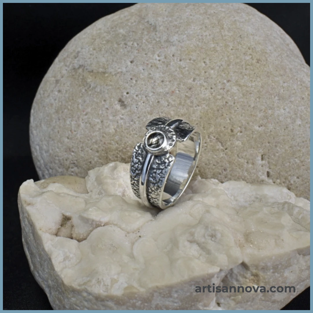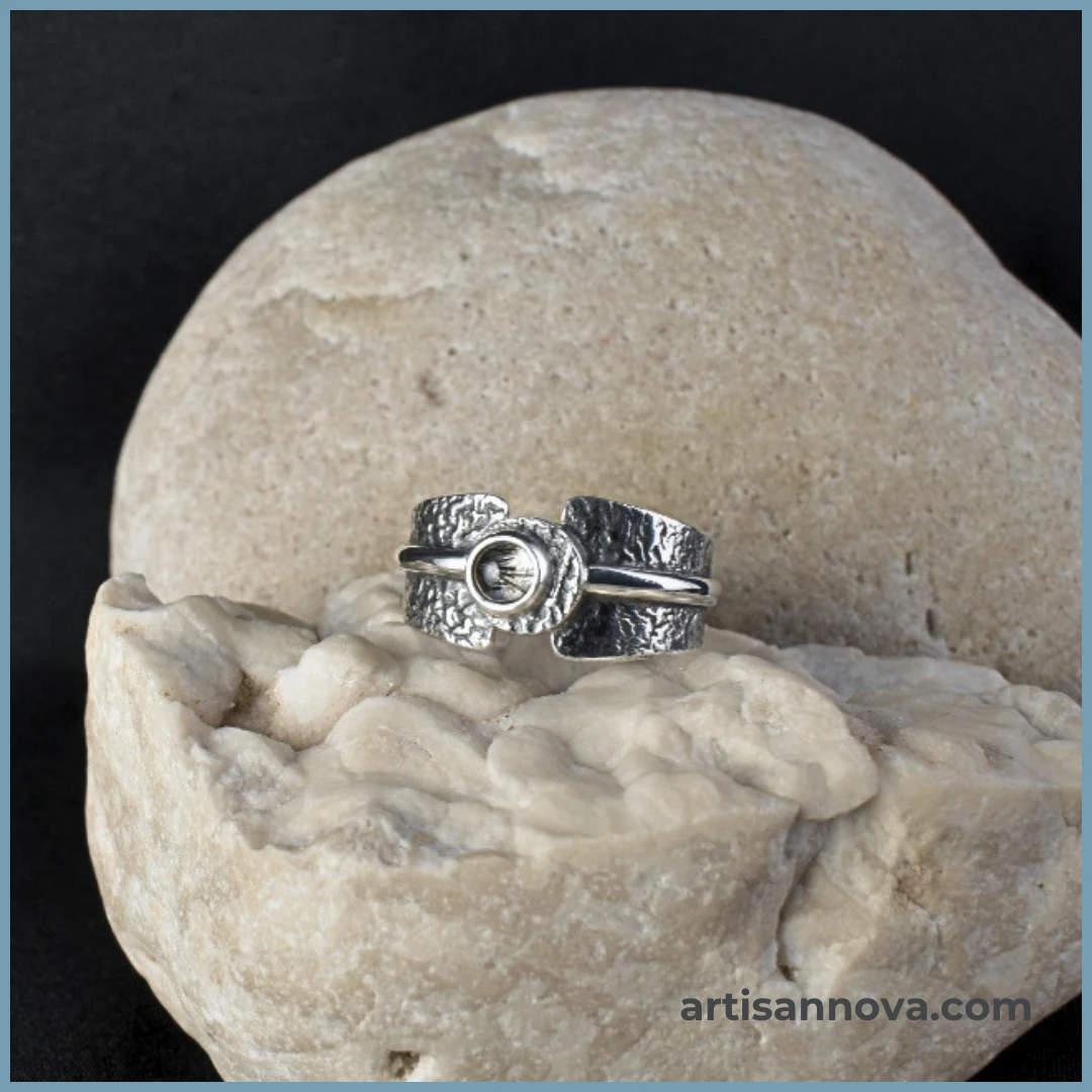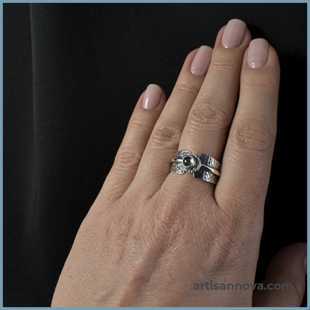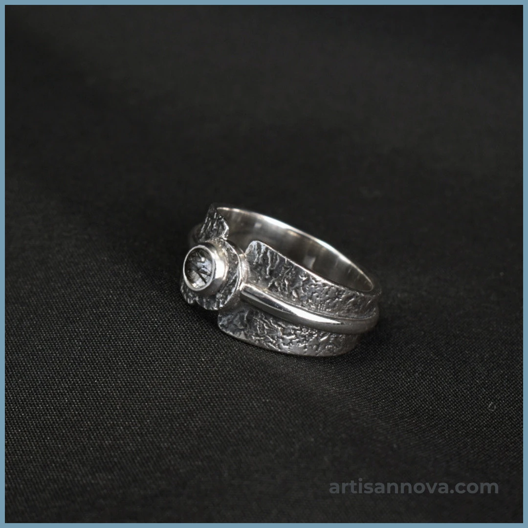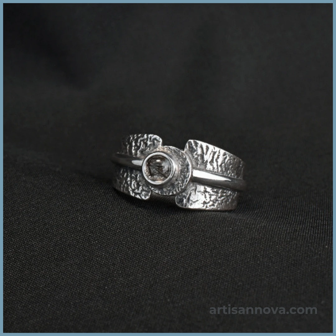 Pierścionek wykonany ręcznie ze srebra próby 925 z kwarcem z inkluzjami turmalinu w oprawie lusterkowej. Szeroka, ergonomiczna forma łączy surową oksydowaną fakturę z gładkim połyskiem metalu.