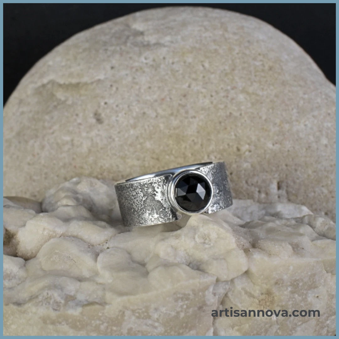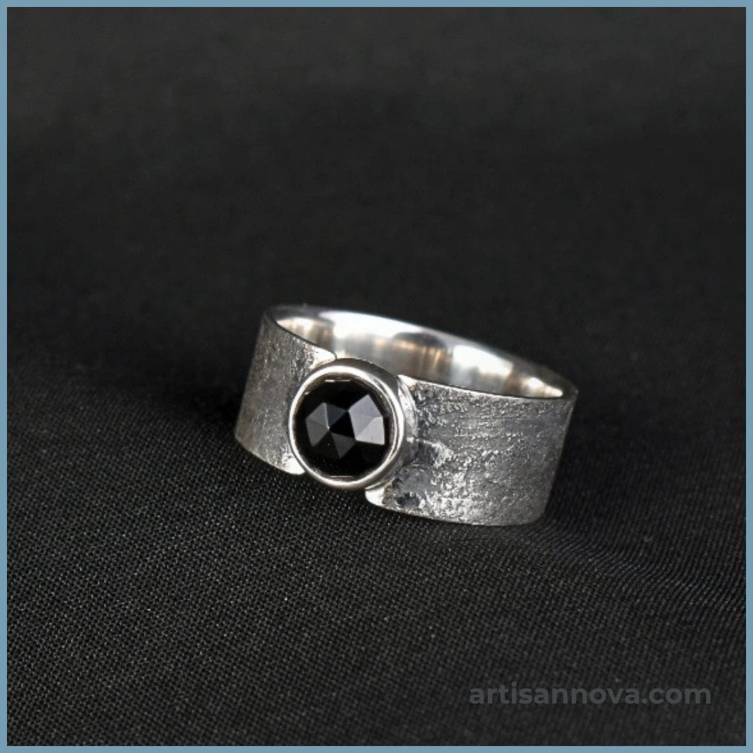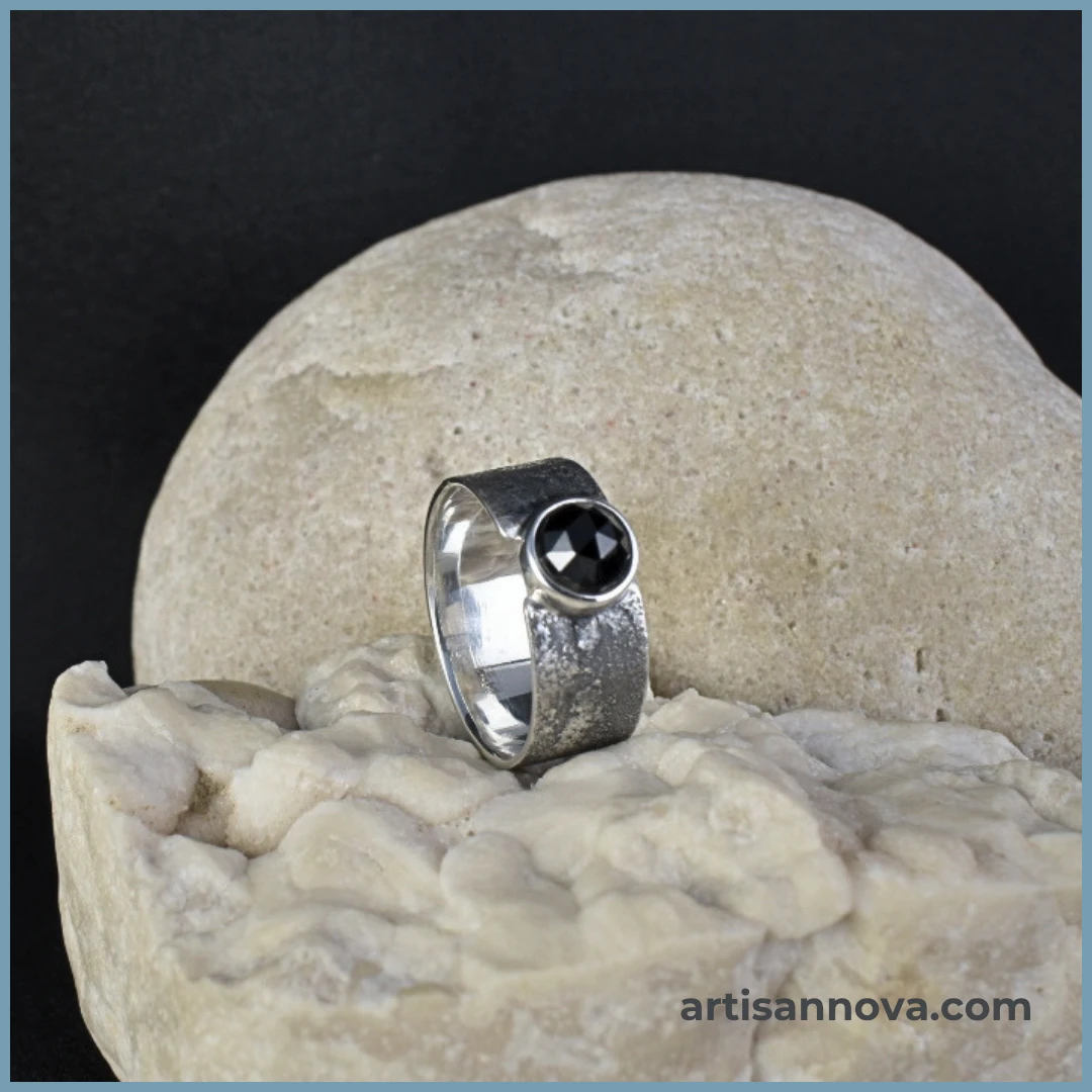 W centrum osadzony został naturalny spinel w głębokim, czarnym kolorze, fasetowany w rozetę. Precyzyjny szlif kontrastuje z surowością obrączki. Kamień odbija światło punktowo, tworząc wyraźne refleksy i optyczną głębię.