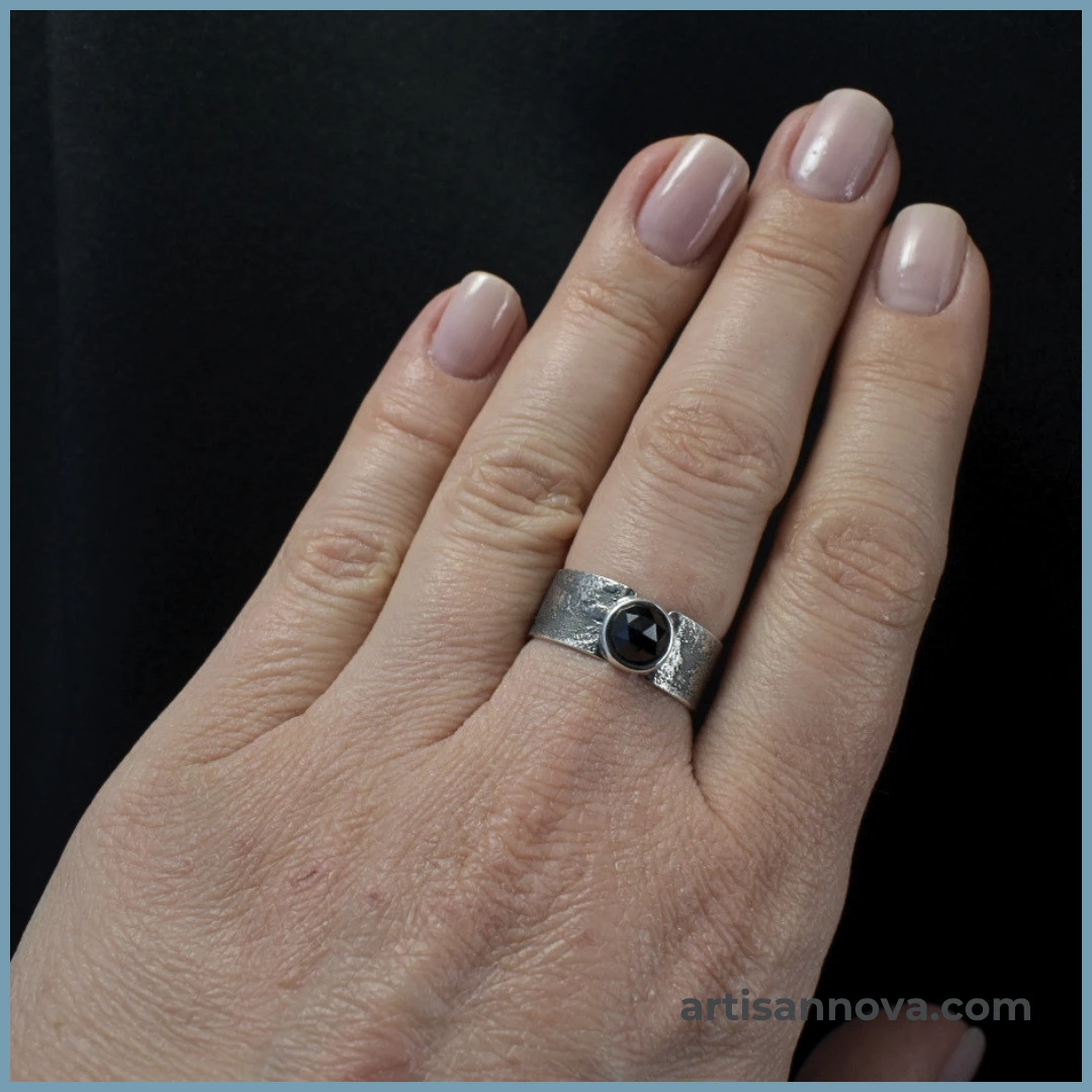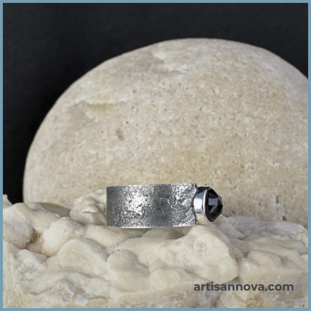 Pierścionek srebro 925 z spinelem w formie szerokiej obrączki o surowej, fakturowanej powierzchni, wykonany ręcznie jako pojedynczy egzemplarz w pracowni jubilerskiej.