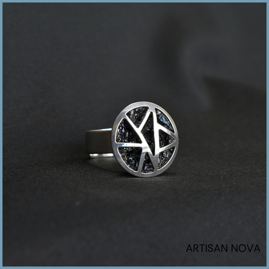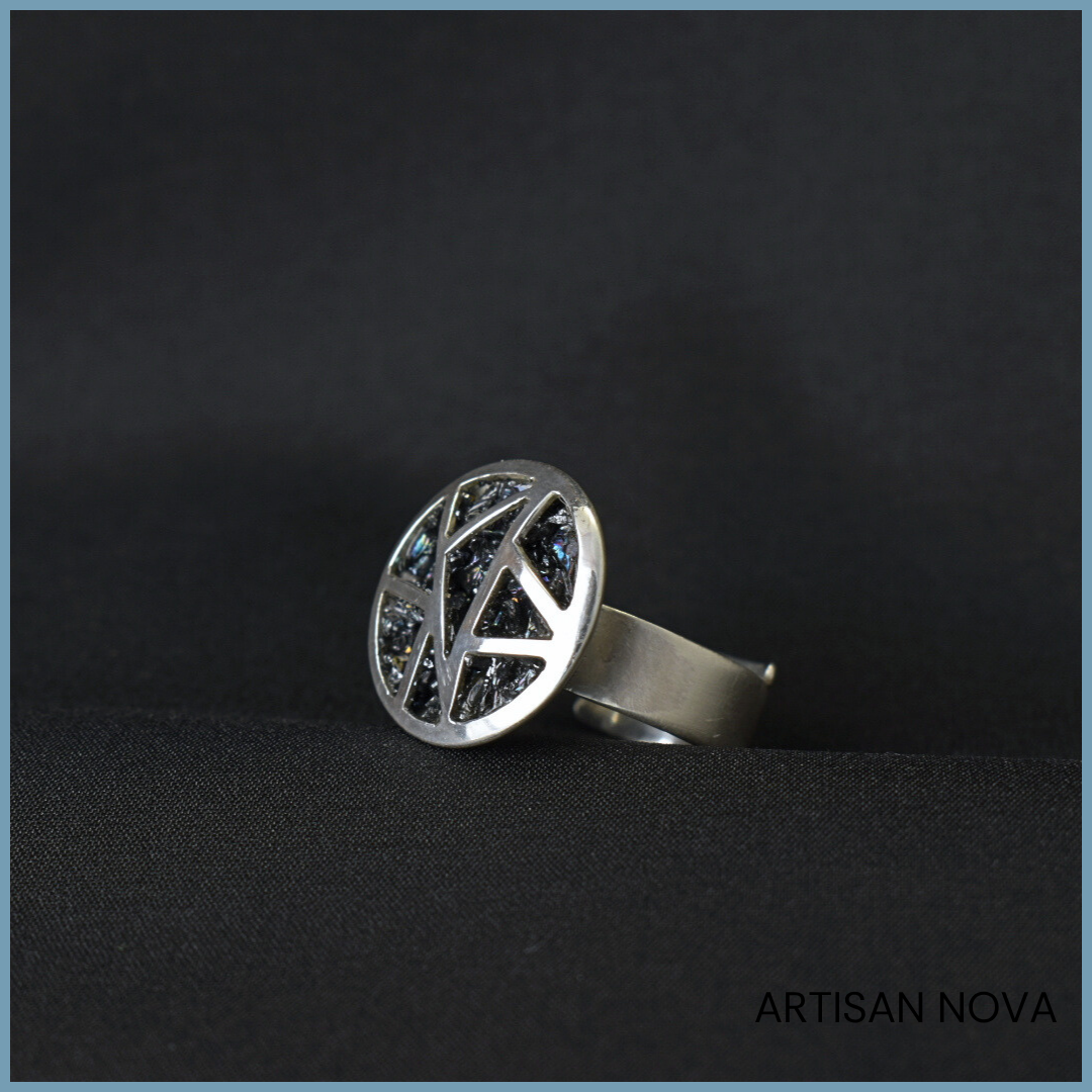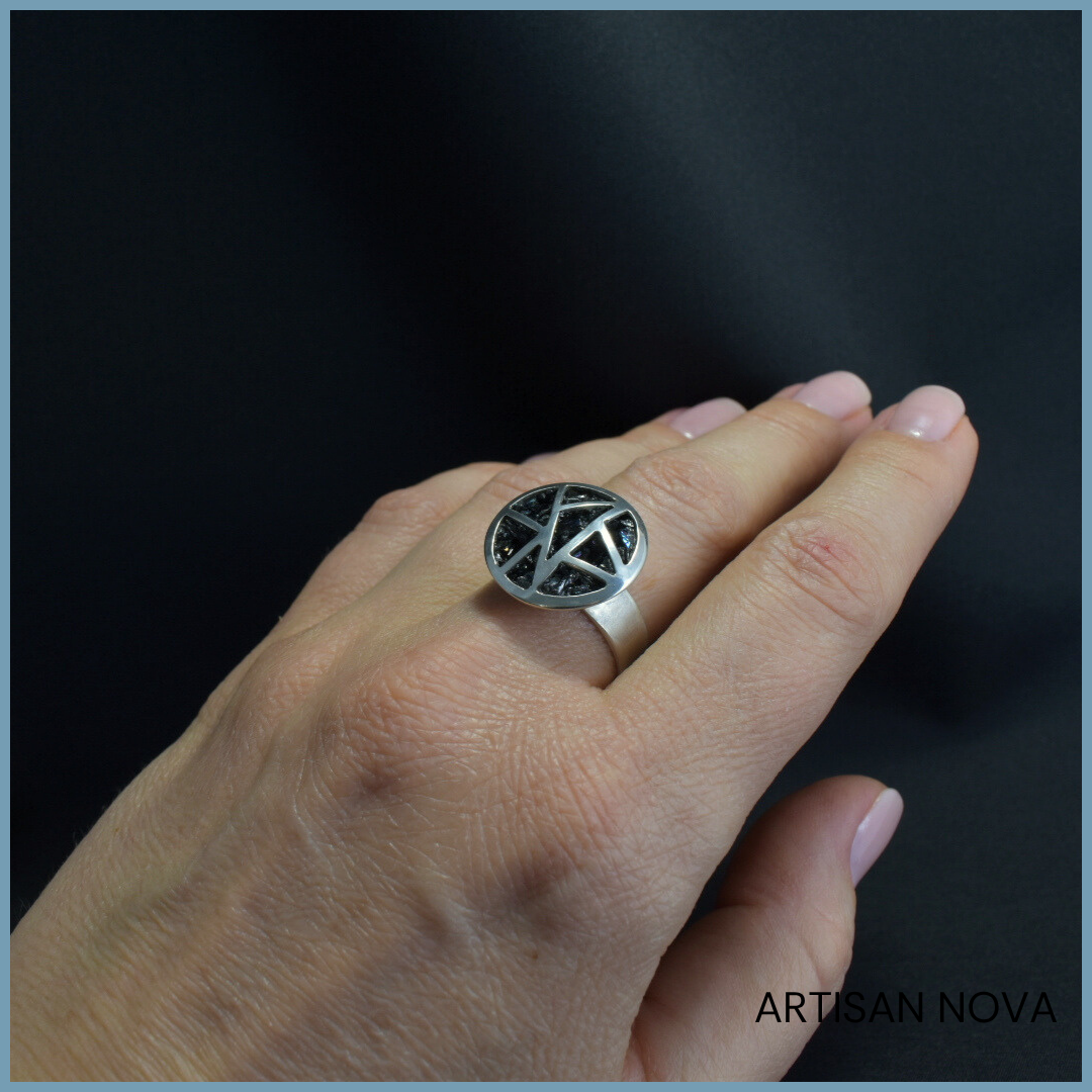 Pierścionek srebro 925 z karbokorundem w geometrycznej, ażurowej formie z regulowaną obrączką w zakresie rozmiarów od 14 do 17.
