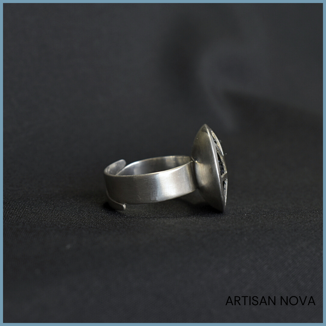 Pierścionek srebro 925 o regulowanej konstrukcji i geometrycznej, ażurowej formie. Centralnym elementem jest karbokorund o nieregularnej strukturze,zakres rozmiaru od 14 do 17 umożliwia dopasowanie.