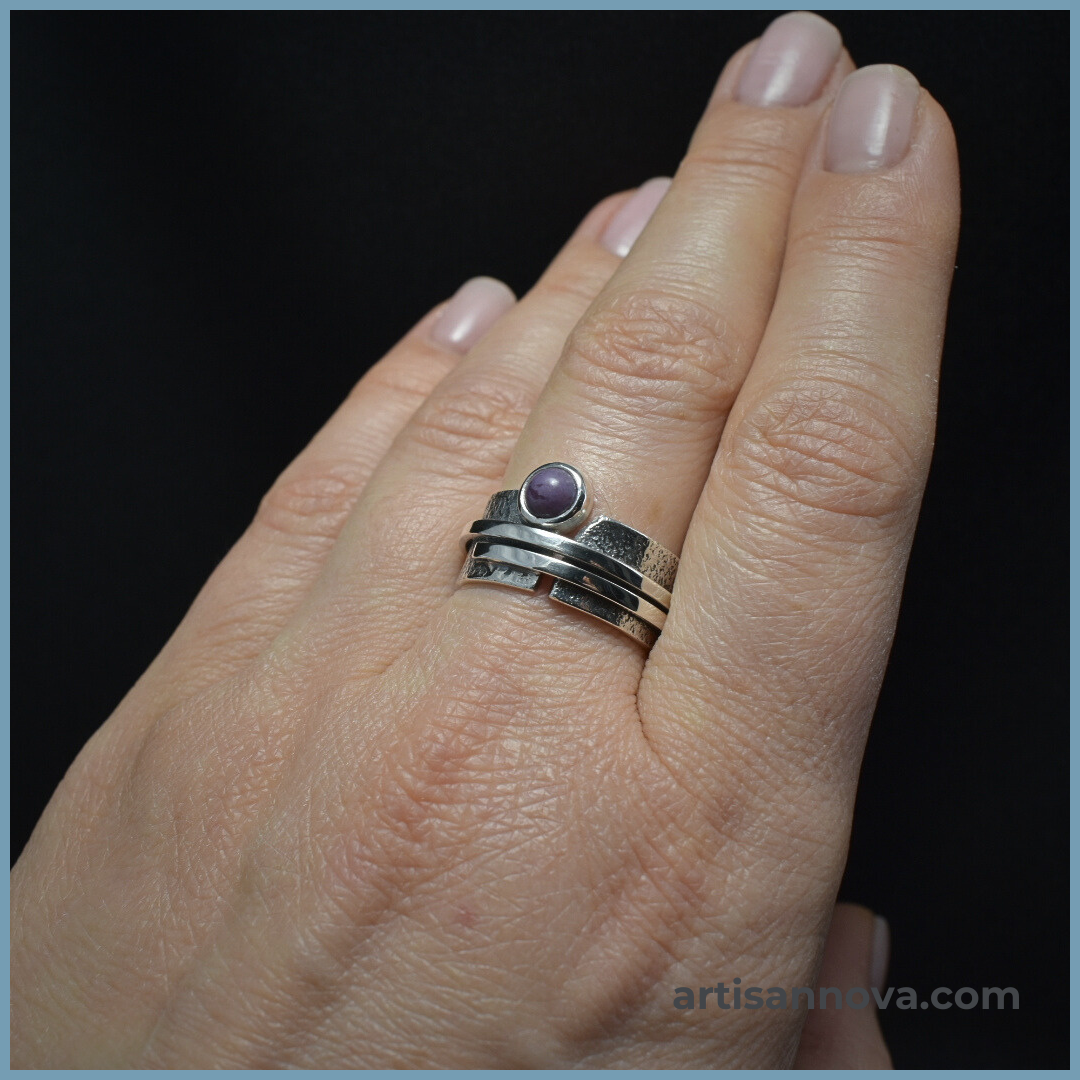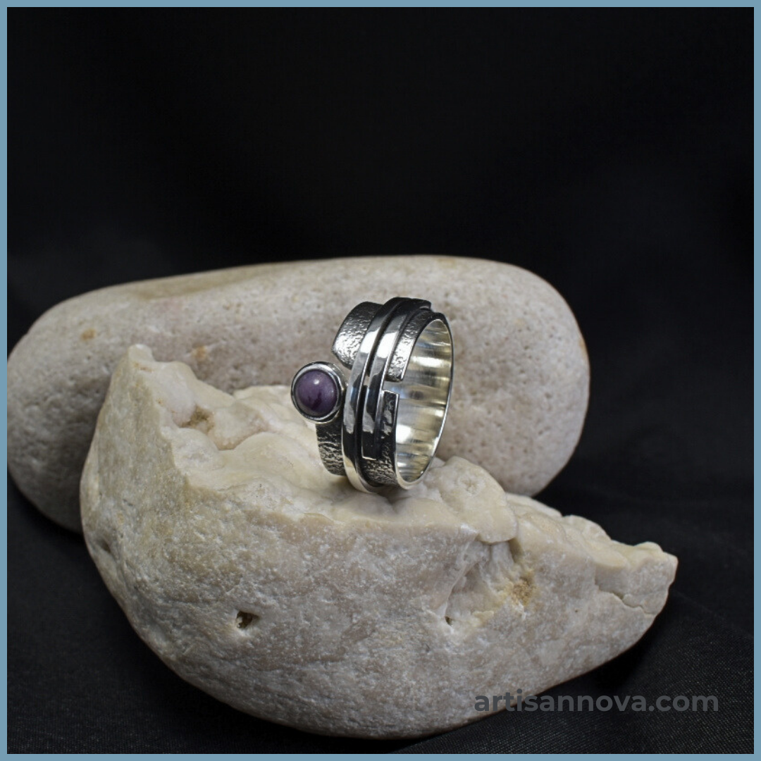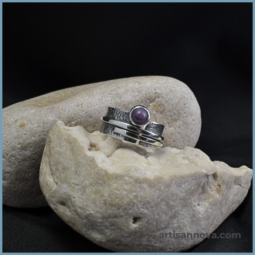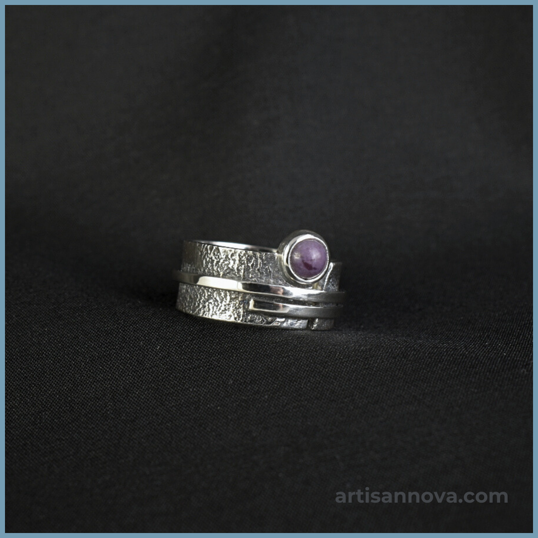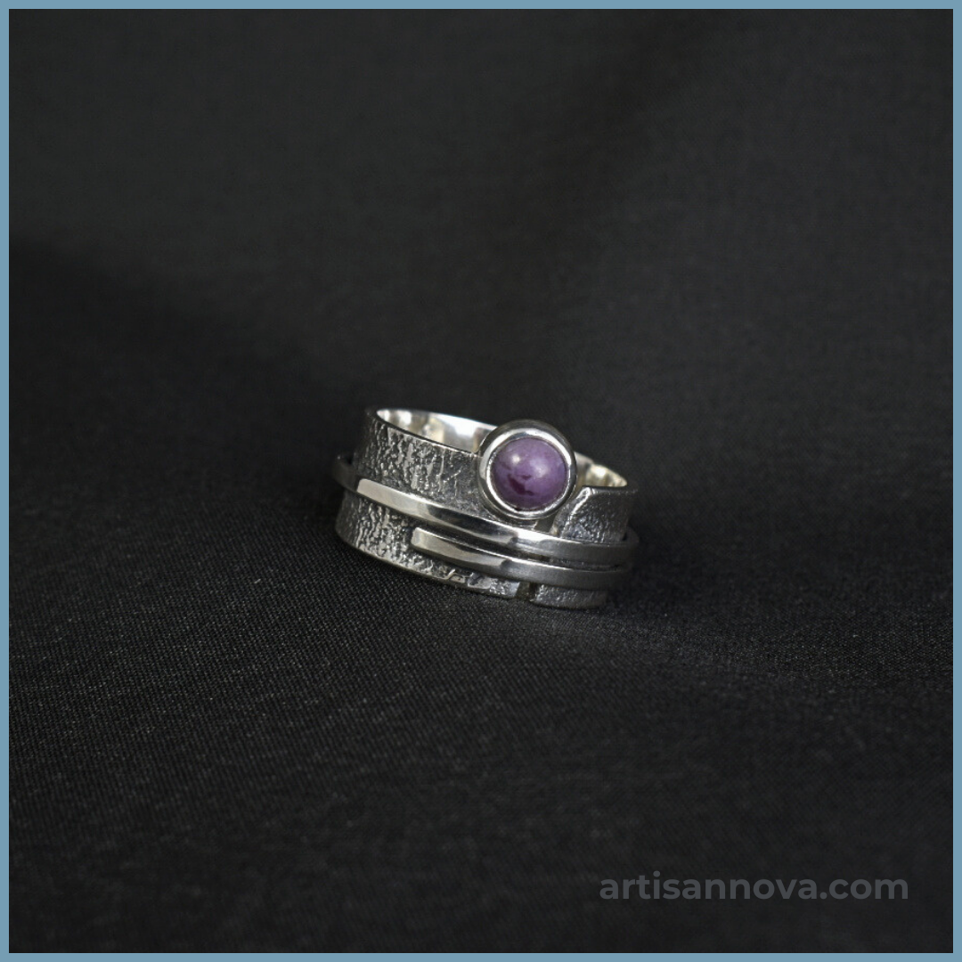 Pierścionek srebro 925 w formie szerokiej regulowanej obrączki o wyraźnej strukturze metalu. Centralnym elementem jest jadeit lawendowy o wrzosowym odcieniu, a zakres rozmiarów 16–19 pozwala na dopasowanie.