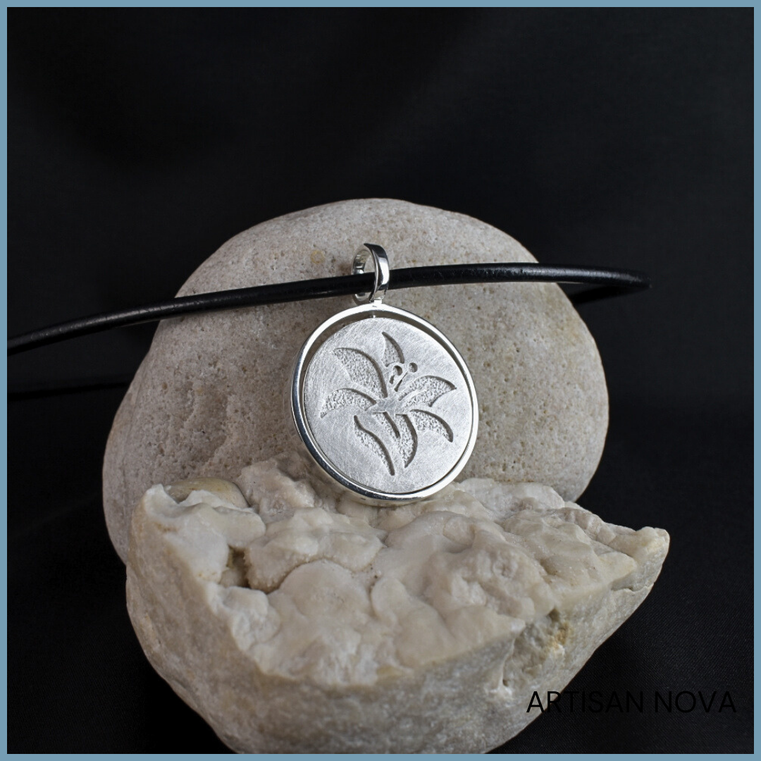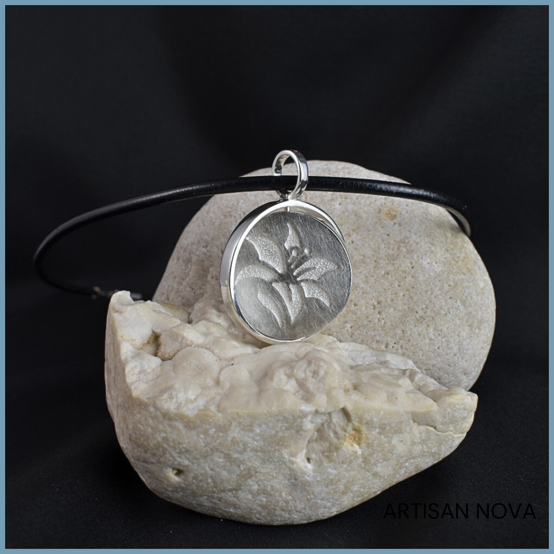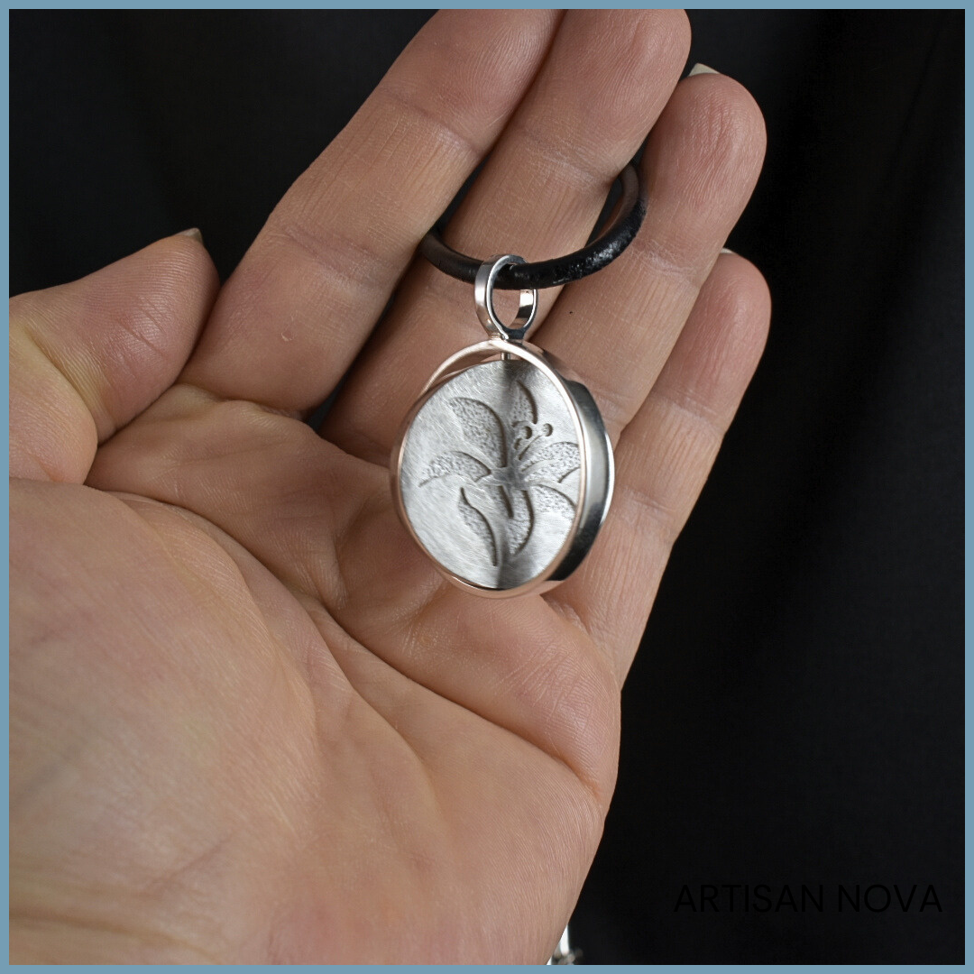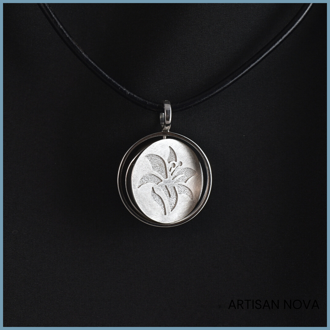 Naszyjnik srebro 925. Ruchomy medalion z wyciętymi motywami lilii i tulipana został zawieszony na rzemieniu ze srebrnym zapięciem.