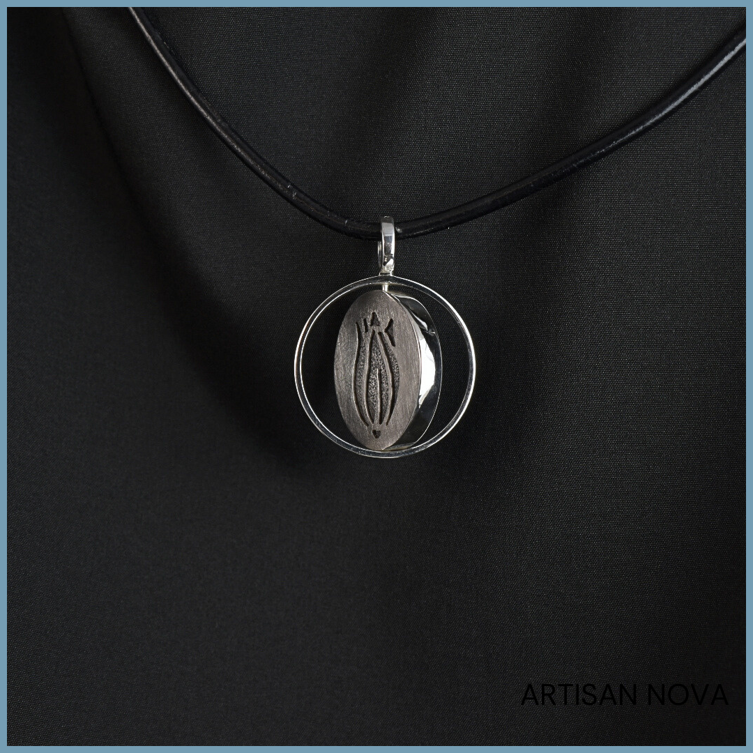 Naszyjnik składa się z okrągłego medalionu z wewnętrznym, obracającym się elementem oraz rzemienia, tworząc formę noszoną blisko szyi.