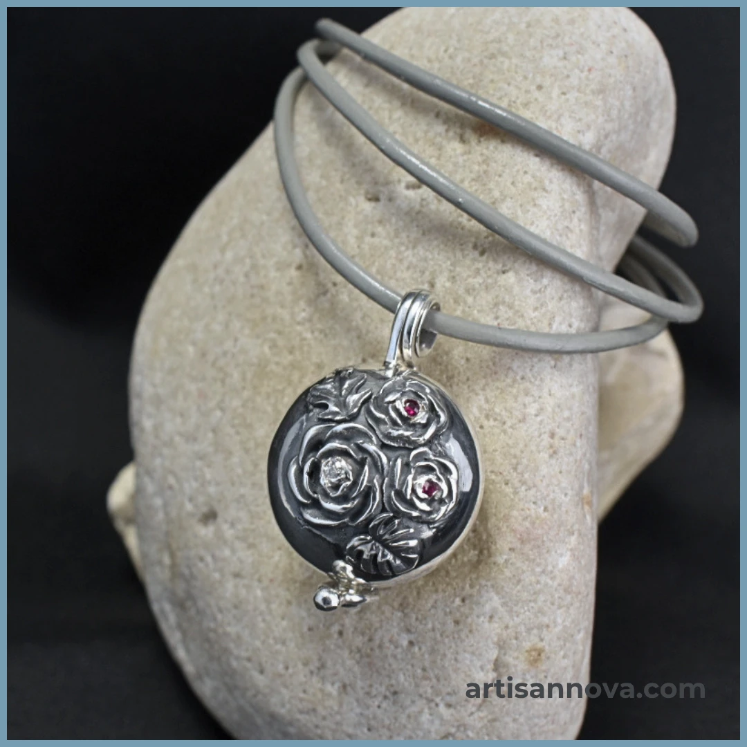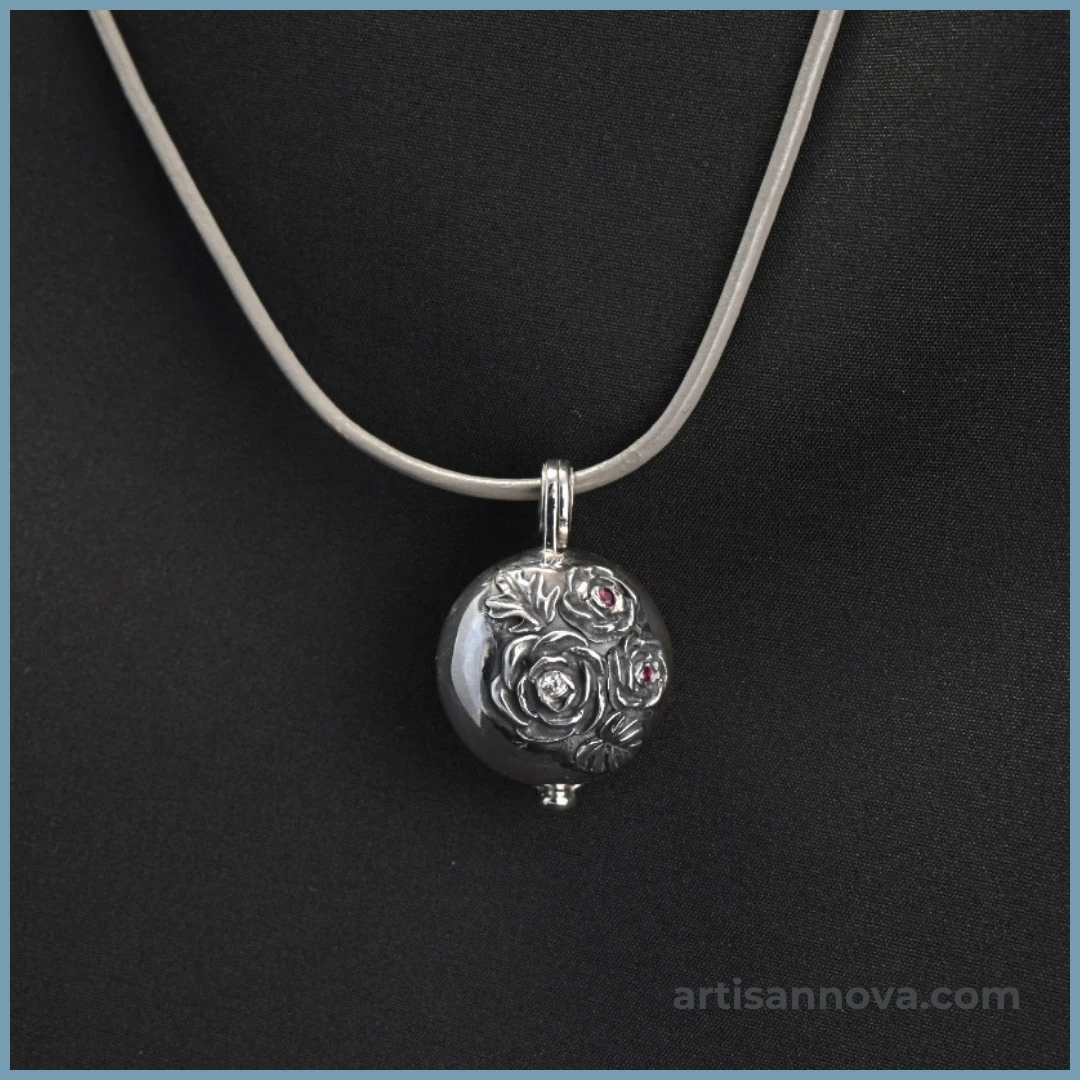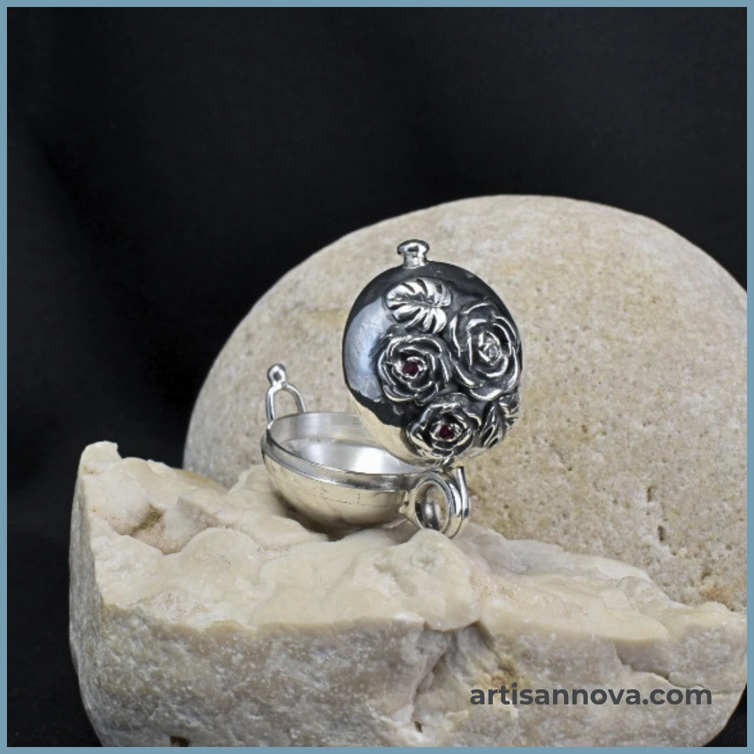 Srebrny sekretnik w formie otwieranej kulki z motywem róż i drobnymi rubinami. Wewnątrz znajduje się niewielka przestrzeń na osobisty przedmiot.