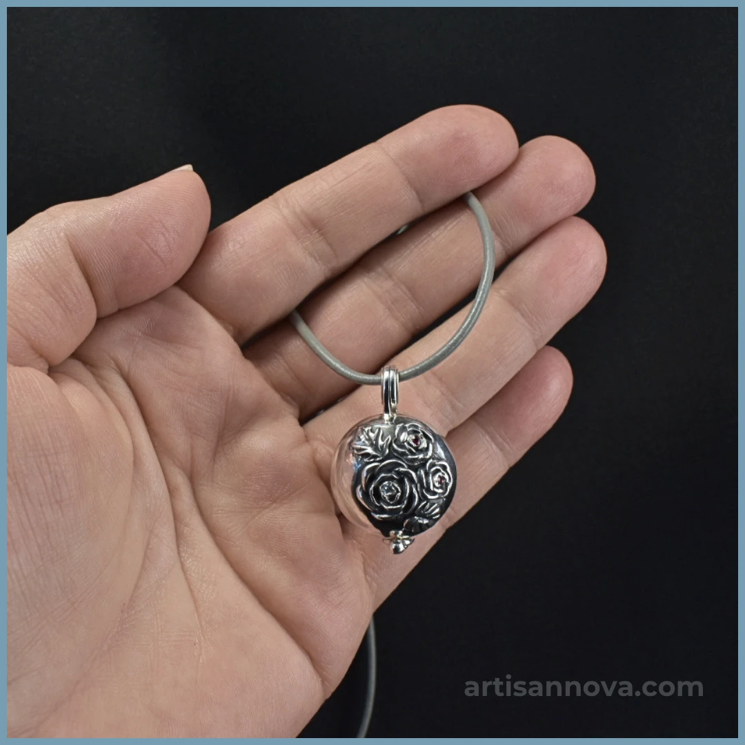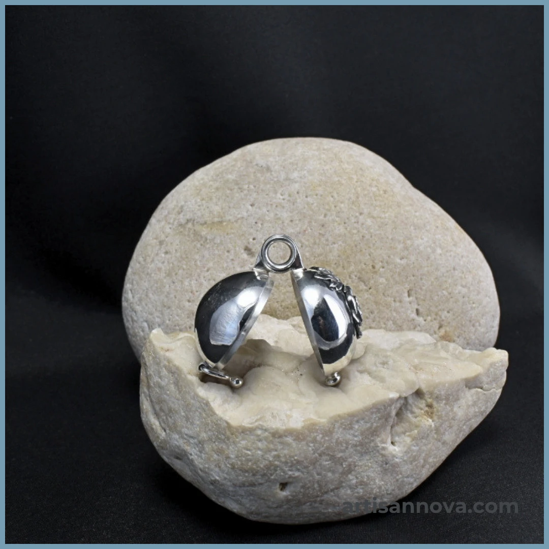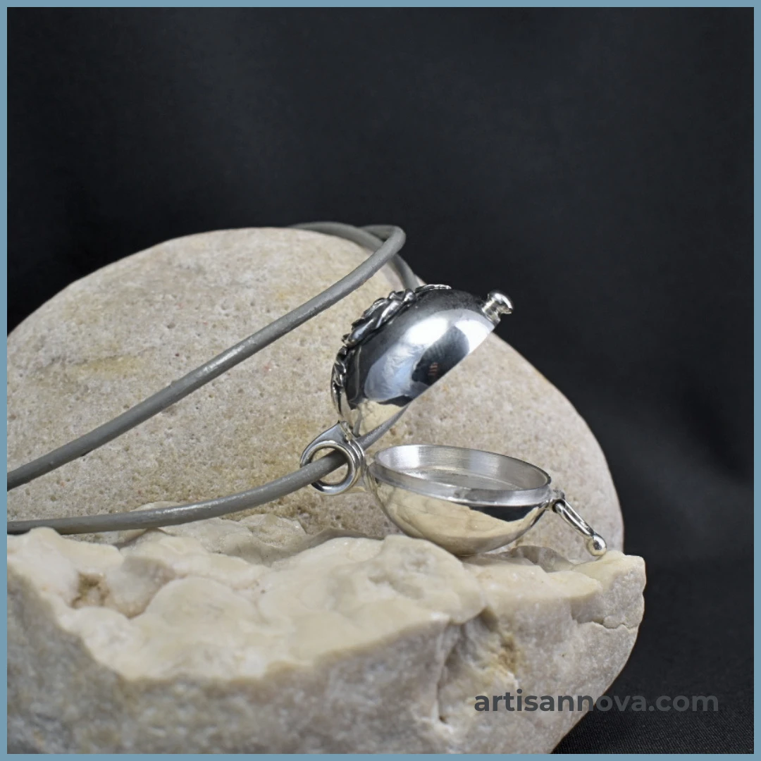 Sekretnik srebro 925 to otwierany naszyjnik o formie lekko spłaszczonej kuli, wykonany ręcznie ze srebra i zawieszony na szarym rzemieniu. Niewielki rozmiar łączy funkcję biżuterii z możliwością przechowywania drobnego, osobistego przedmiotu wewnątrz.