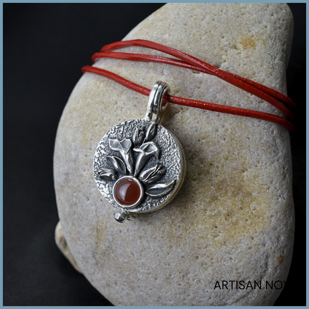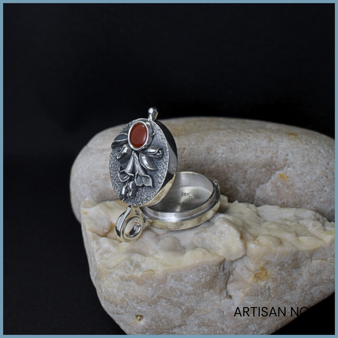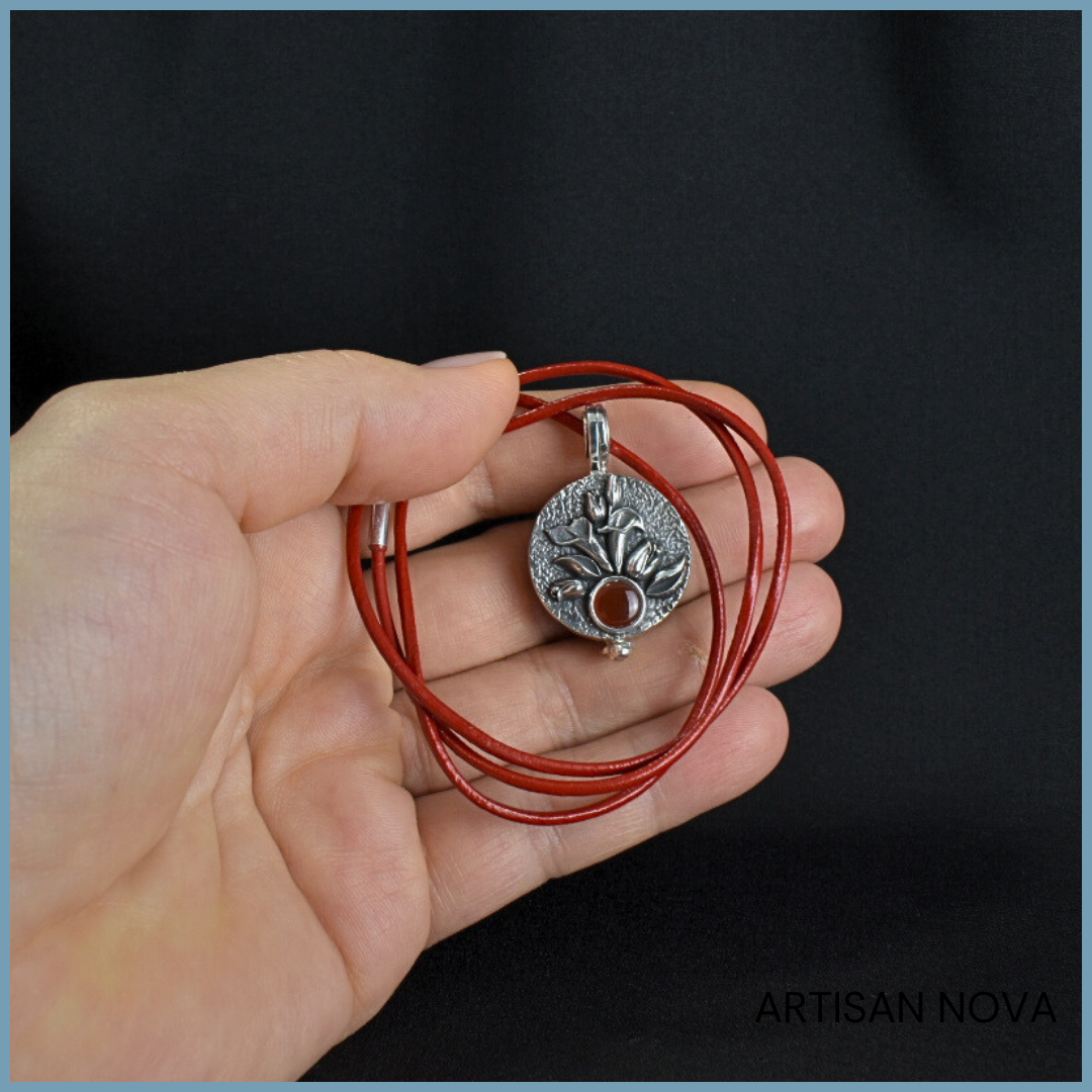 Naszyjnik sekretnik srebro 925 z karneolem to ręcznie wykonany medalion o zamykanej konstrukcji, przeznaczony do noszenia na szyi jako biżuteria osobista.