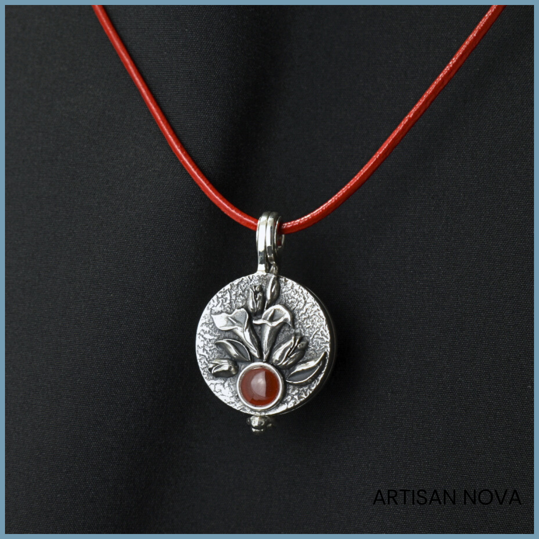 Naszyjnik sekretnik ze srebra 925 zawieszony na czerwonym rzemieniu. Naturalny karneol i otwierana forma medalionu pozwalają przechowywać drobny przedmiot wewnątrz biżuterii.